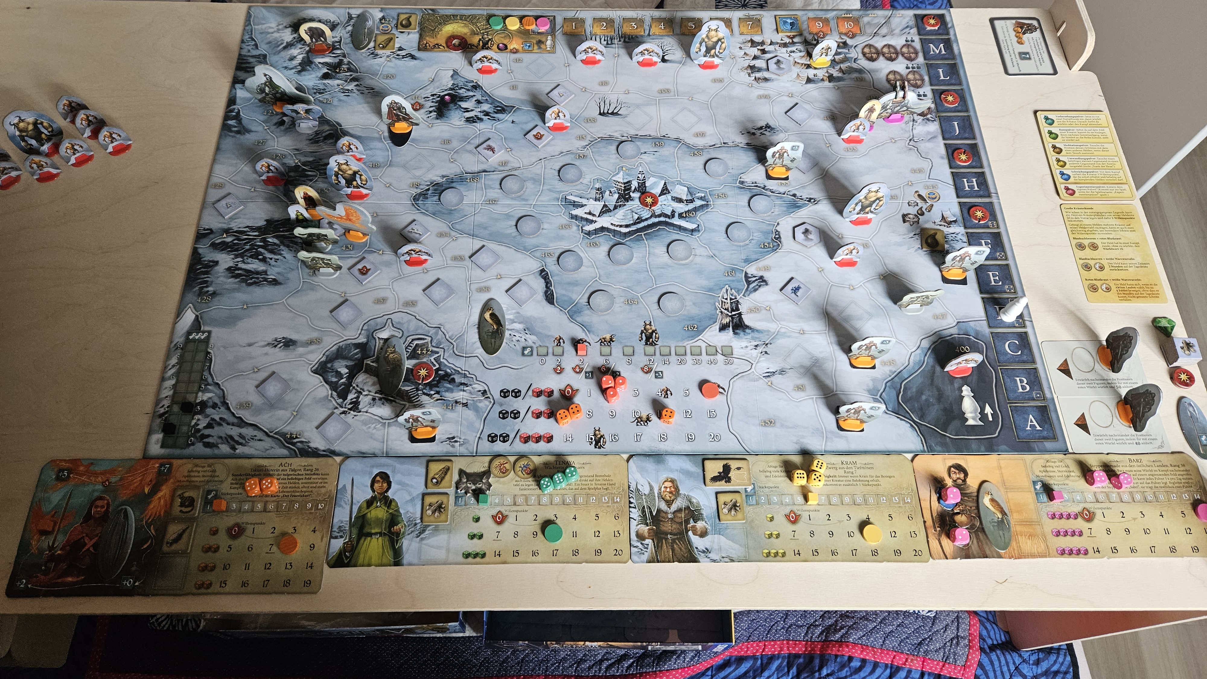 - Barz wanderte bis zum Knochenturm auf Feld 450 (7.h) und rettete den Hornfalken vor den Wilderern. Mit dem Fernrohr erspähte er auf Feld 449 ebenfalls Blaubachbeeren und auf 451 Brennholz. Dann schickte er das Fernrohr an Kram, der von seinem Feld aus den Schnee absuchte: Auf den Feldern 408 und 411 sah er jeweils 1 Schneesturm und auf 412 1x rotes Blutkraut.