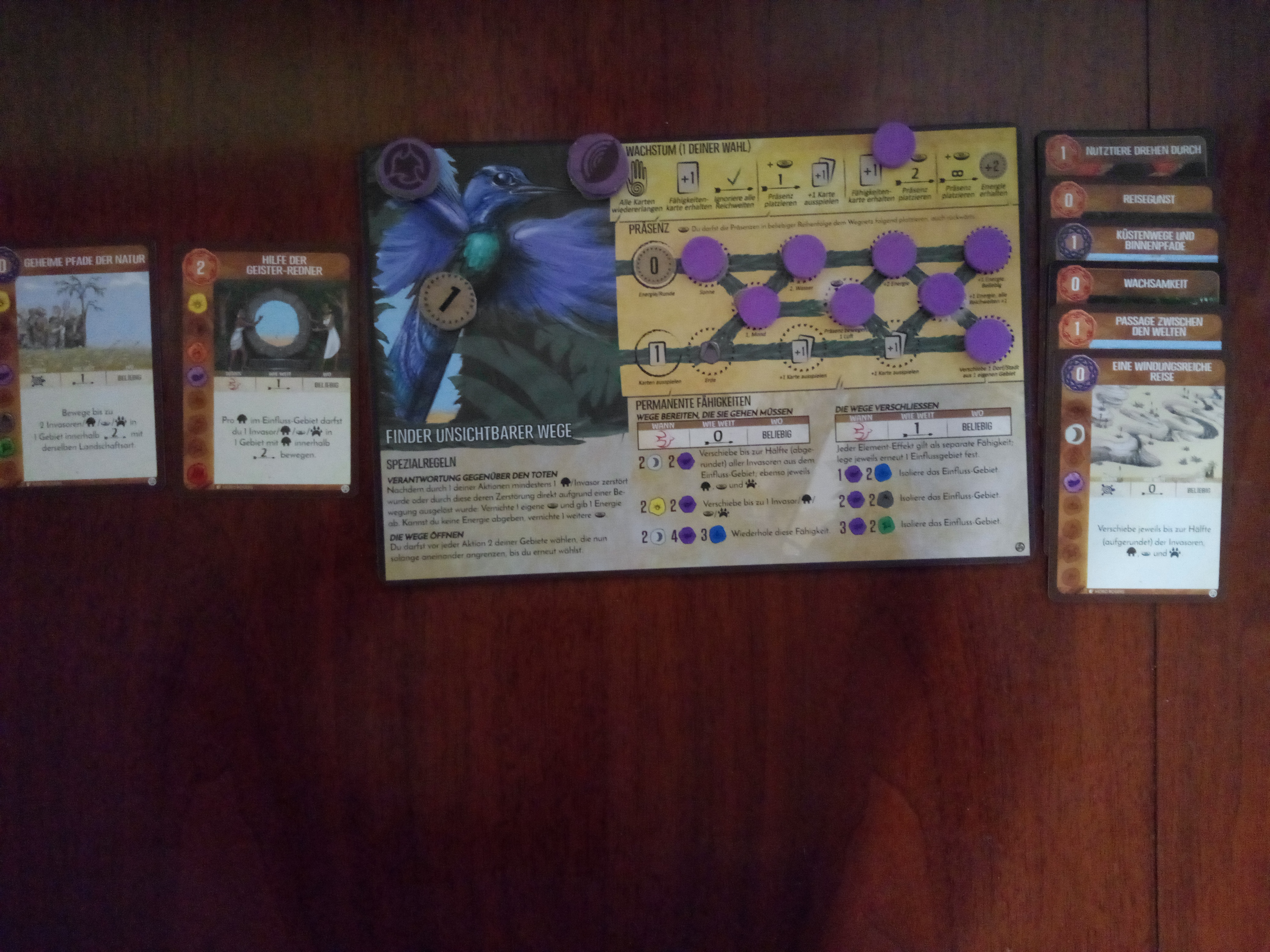 Alle Karten wieder auf die Hand, +1 Energie (=4) und ich ziehe die "Weitreichende Wirkung" (kann vielleicht noch nützlich sein, da meine PFs nur eine Reichweite von 0 haben). Ich spiele 2 Karten aus.