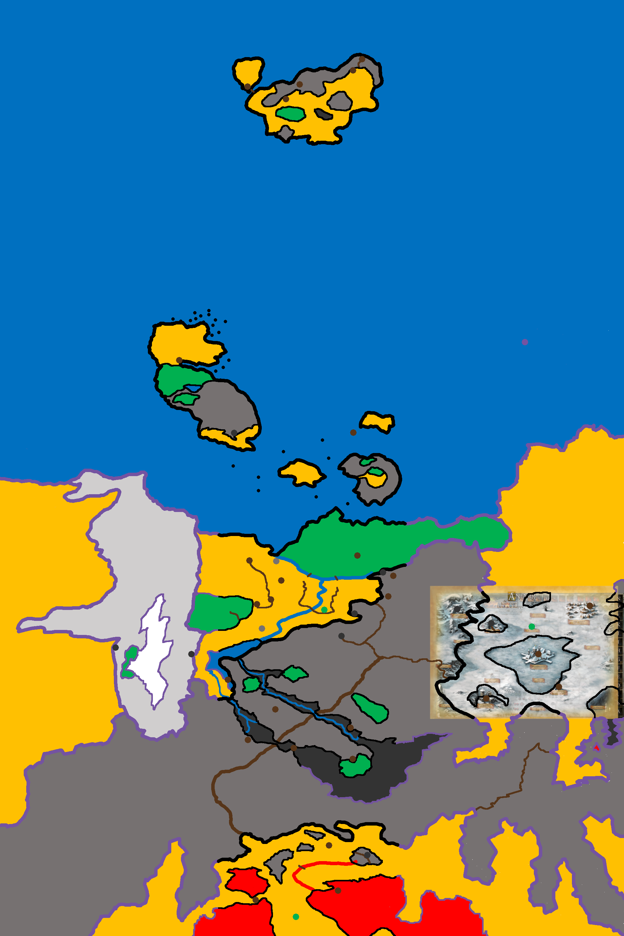 ● Ein bisschen kreativer und potentiell kontroverser ging ich mit dem Gebirge zwischen LddB und Krahd um. Wir wissen jetzt, dass gleich drei Stellen dort Drachenschweif, Drachenbuckel und Drachenschlund genannt werden. Da wollte ich zumindest ausprobieren, ob es möglich ist, die Stelle aus der Vogelperspektive ein bisschen wie einen Drachen aussehen zu lassen, ohne dass es allzu künstlich wirkt. Rückmeldungen äußerst erwünscht!