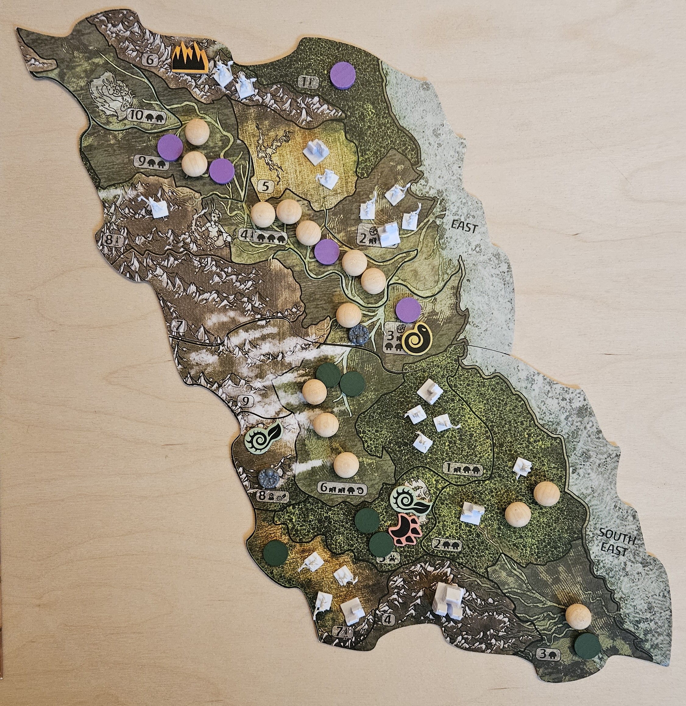 Invasorenphase Wüten: in O3 wird mit 4 gewütet, mit 7 verteidigt. Die beiden Dahan zerstören die Stadt und machen 1 Schaden am Dorf!
