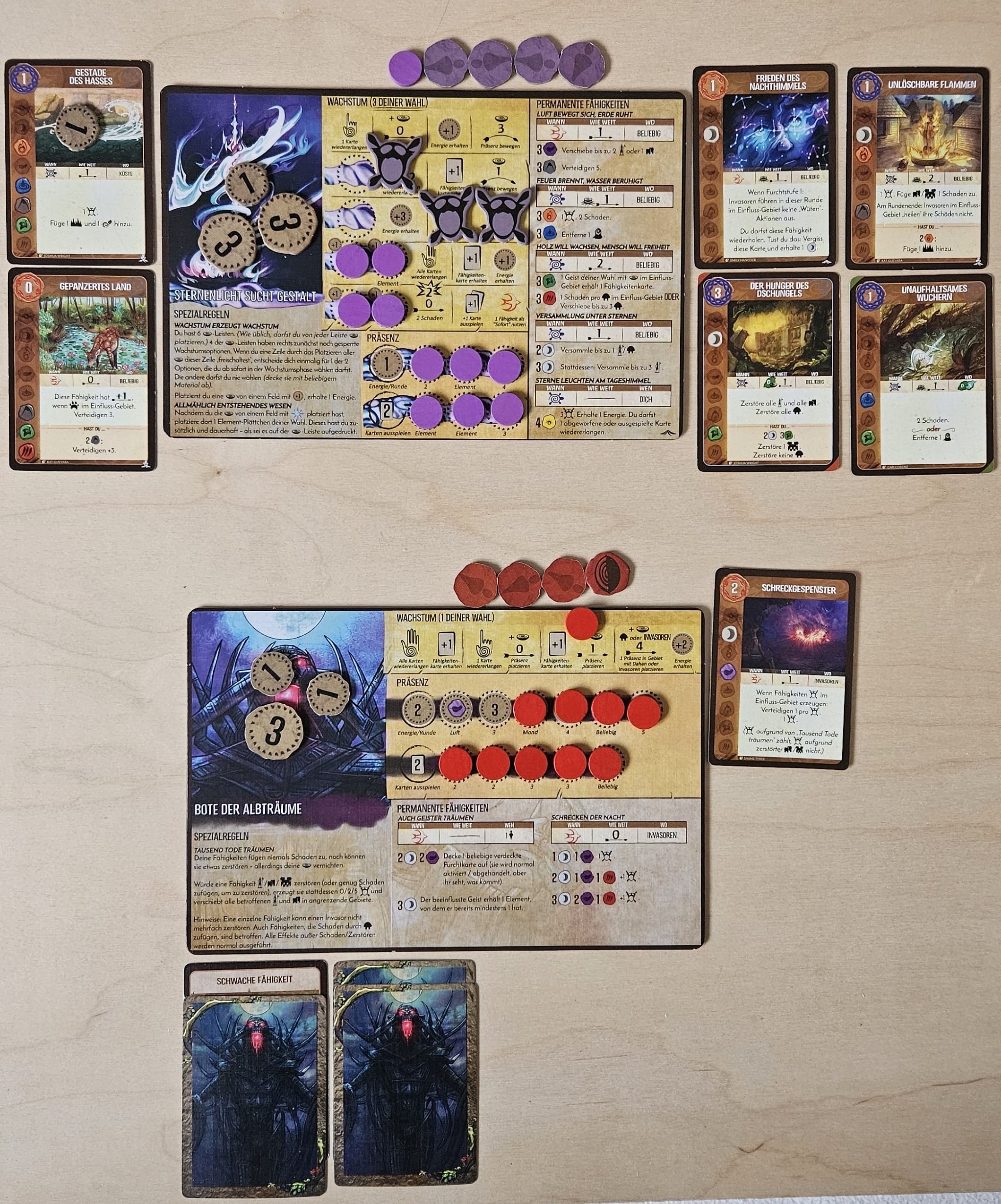 Ich setze eine Präsenz von der oberen Leiste (für das Mond-Element) nach B7 und nehme die "Anrufung der Mitternachtsträume" zurück auf die Hand. Ich erhalte 3 Energie (=8) und spiele meine 2 verbliebenen Karten aus.