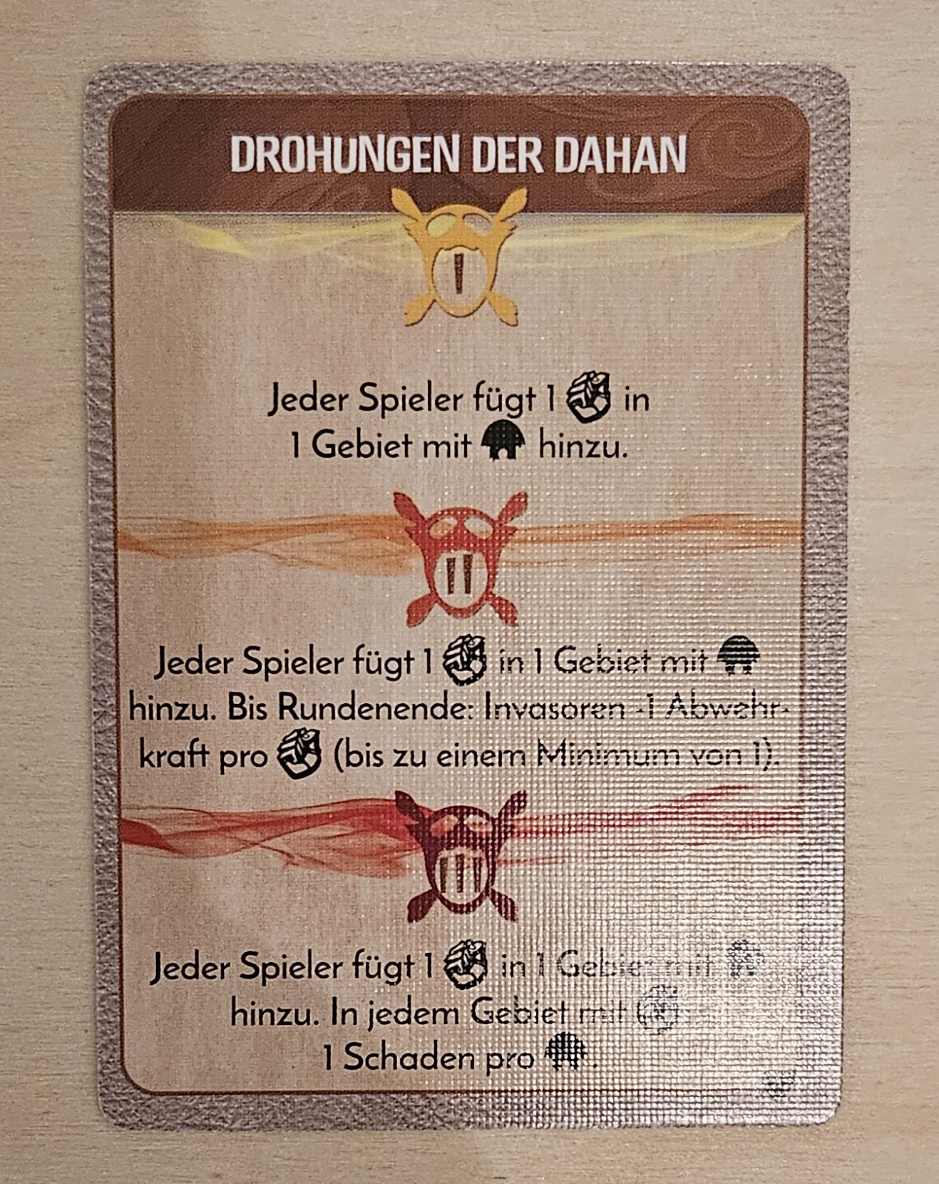 Vom Furchtboten erhalte ich ein Element meiner Wahl, ich wähle eine Sonne, dann habe ich 2 Sonnen und 3 Erde für den zusätzlichen Elementeffekt des Unaufhaltsamen Anspruches, und 3 Erde, um C6 mit +5 zu verteidigen.