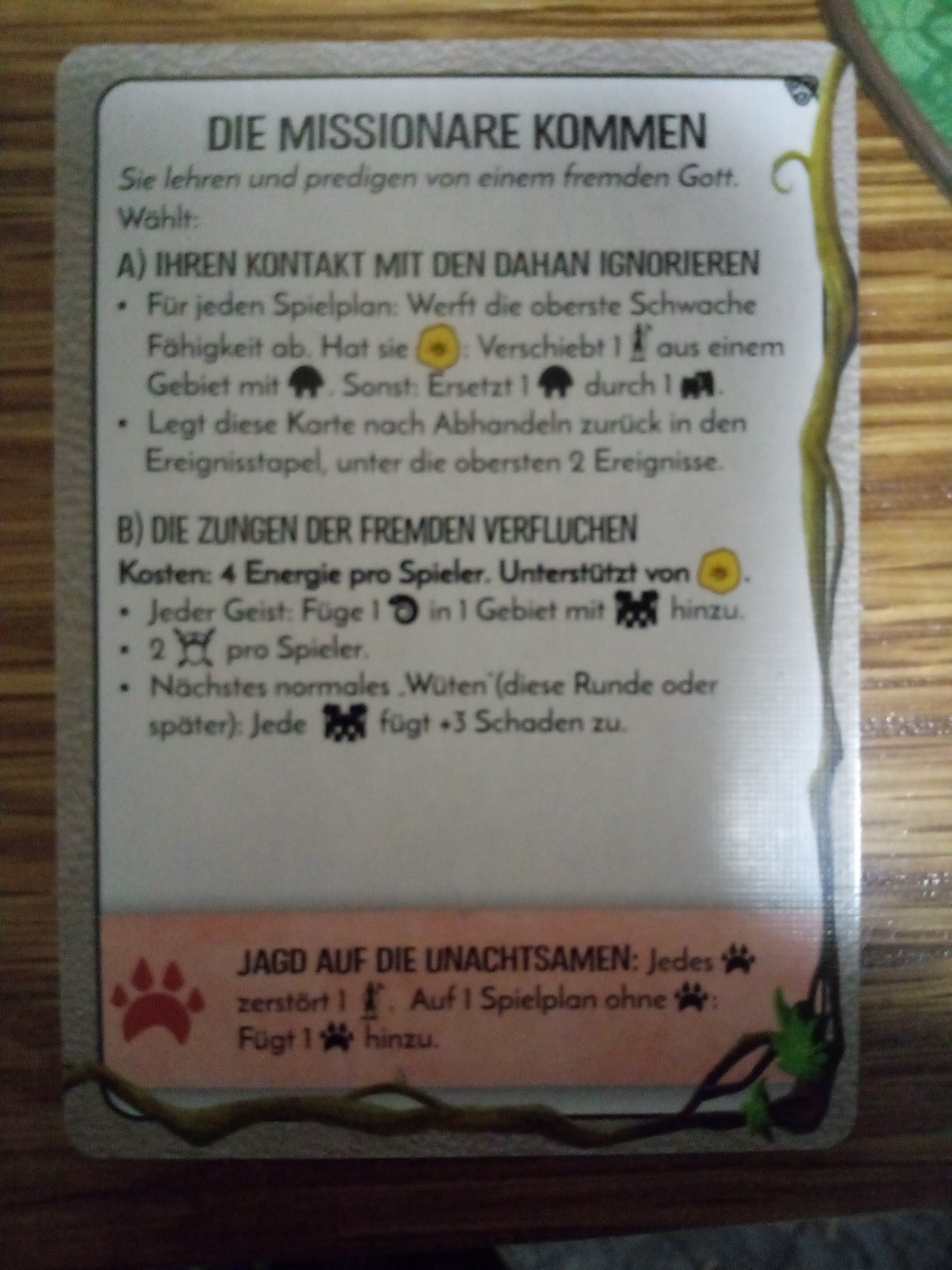 - "Erstickender Rauch" auf F2. Das neu gebaute Dorf wird zerstört (+2 Furcht) und der Dahan wird nach F1 verschoben.