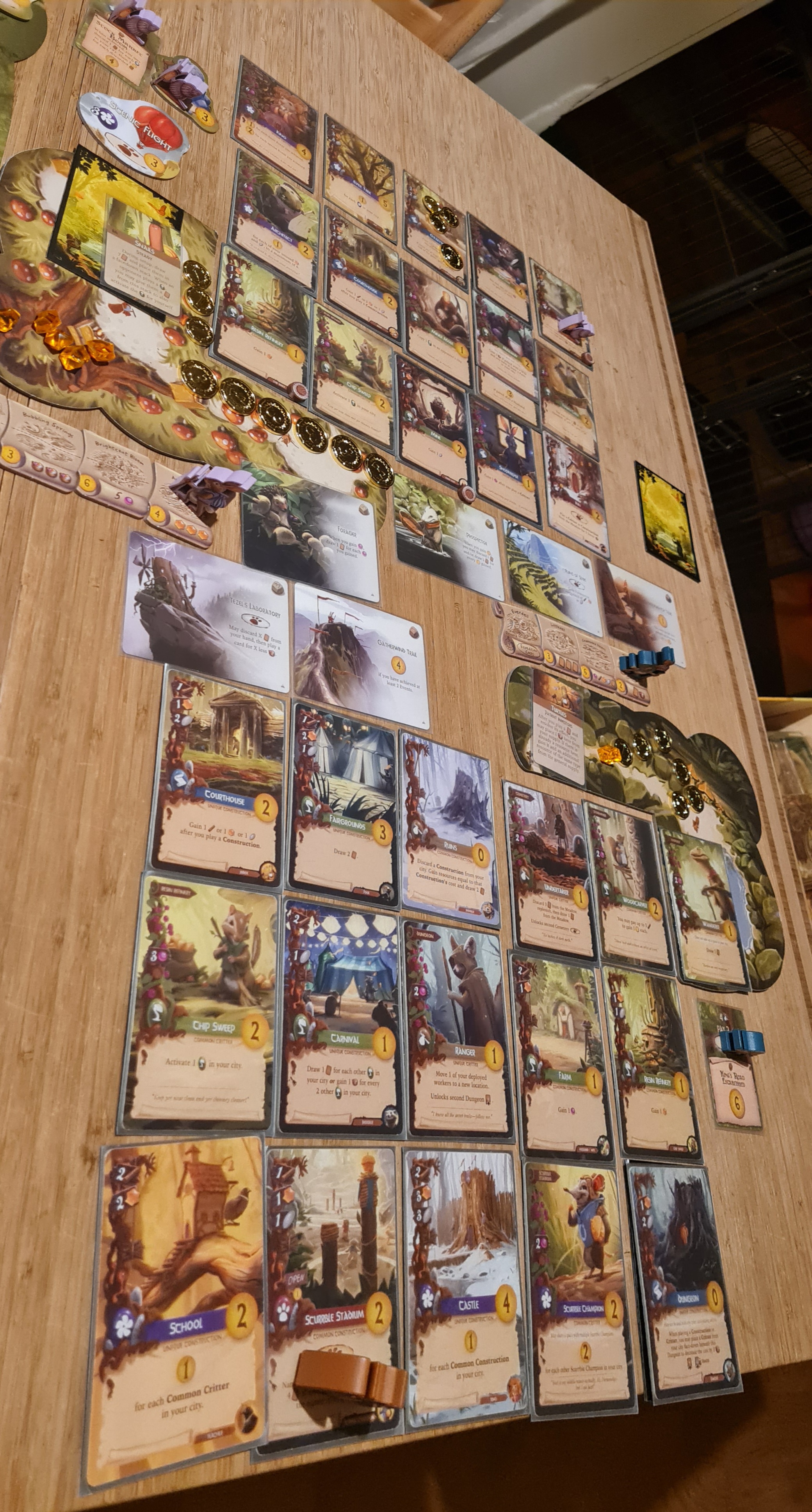Wie sich herausgestellt hat, die Fledermäuse sind ein ziemlich fies zu spielendes Volk, weil sie so ziemlich alle violetten Wohlstandskarten aus der Wiese in ihr Archiv gezogen haben, die Schildkröten kamen im Gebirge leider überhaupt nicht zurecht, und bei den Schnecken machte sich ihre Beharrlichkeit gerade zum Ende hin bezahlt, wo sie noch einmal gewaltig Punkte abräumten.