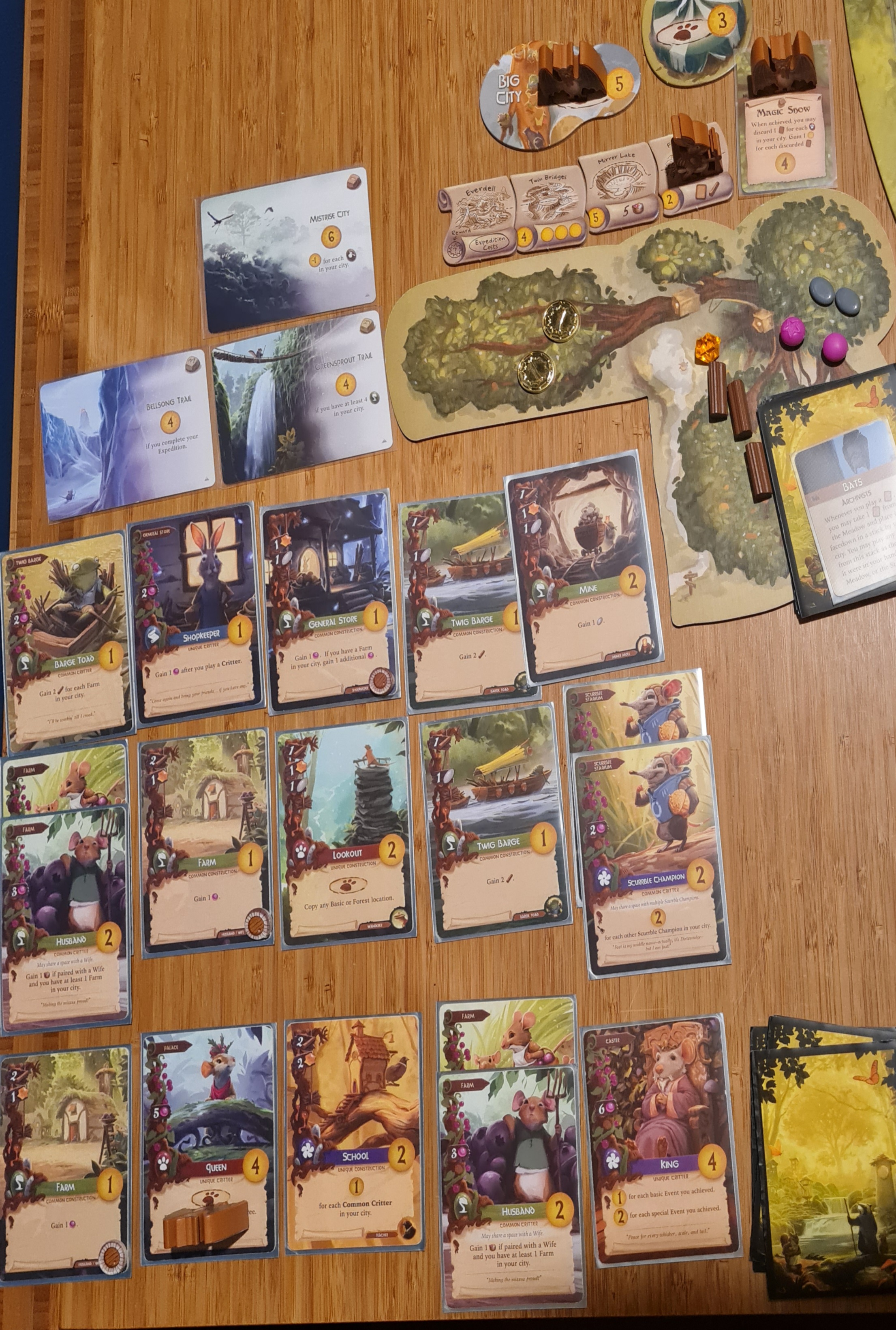 Wie sich herausgestellt hat, die Fledermäuse sind ein ziemlich fies zu spielendes Volk, weil sie so ziemlich alle violetten Wohlstandskarten aus der Wiese in ihr Archiv gezogen haben, die Schildkröten kamen im Gebirge leider überhaupt nicht zurecht, und bei den Schnecken machte sich ihre Beharrlichkeit gerade zum Ende hin bezahlt, wo sie noch einmal gewaltig Punkte abräumten.