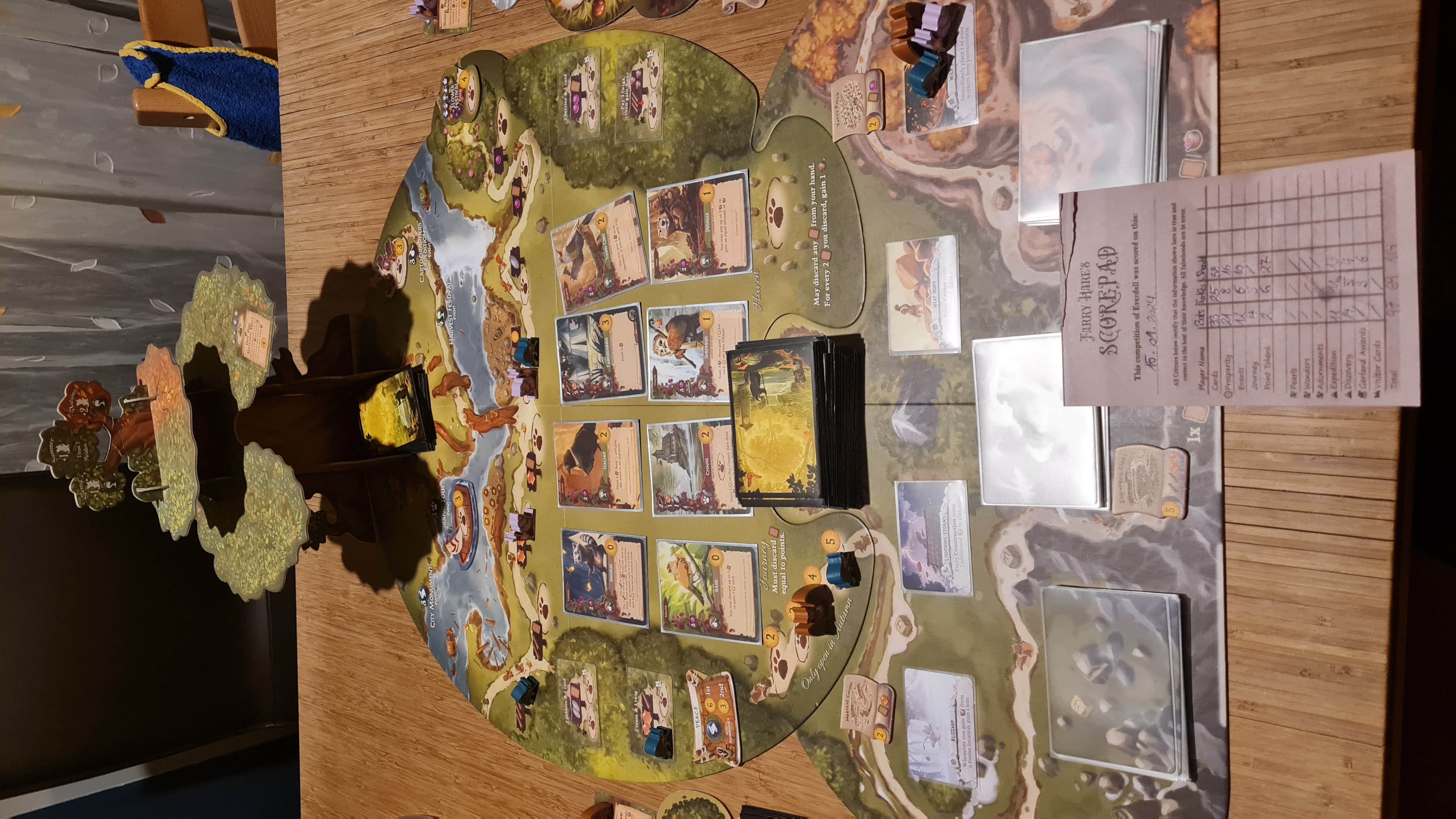 Wie sich herausgestellt hat, die Fledermäuse sind ein ziemlich fies zu spielendes Volk, weil sie so ziemlich alle violetten Wohlstandskarten aus der Wiese in ihr Archiv gezogen haben, die Schildkröten kamen im Gebirge leider überhaupt nicht zurecht, und bei den Schnecken machte sich ihre Beharrlichkeit gerade zum Ende hin bezahlt, wo sie noch einmal gewaltig Punkte abräumten.