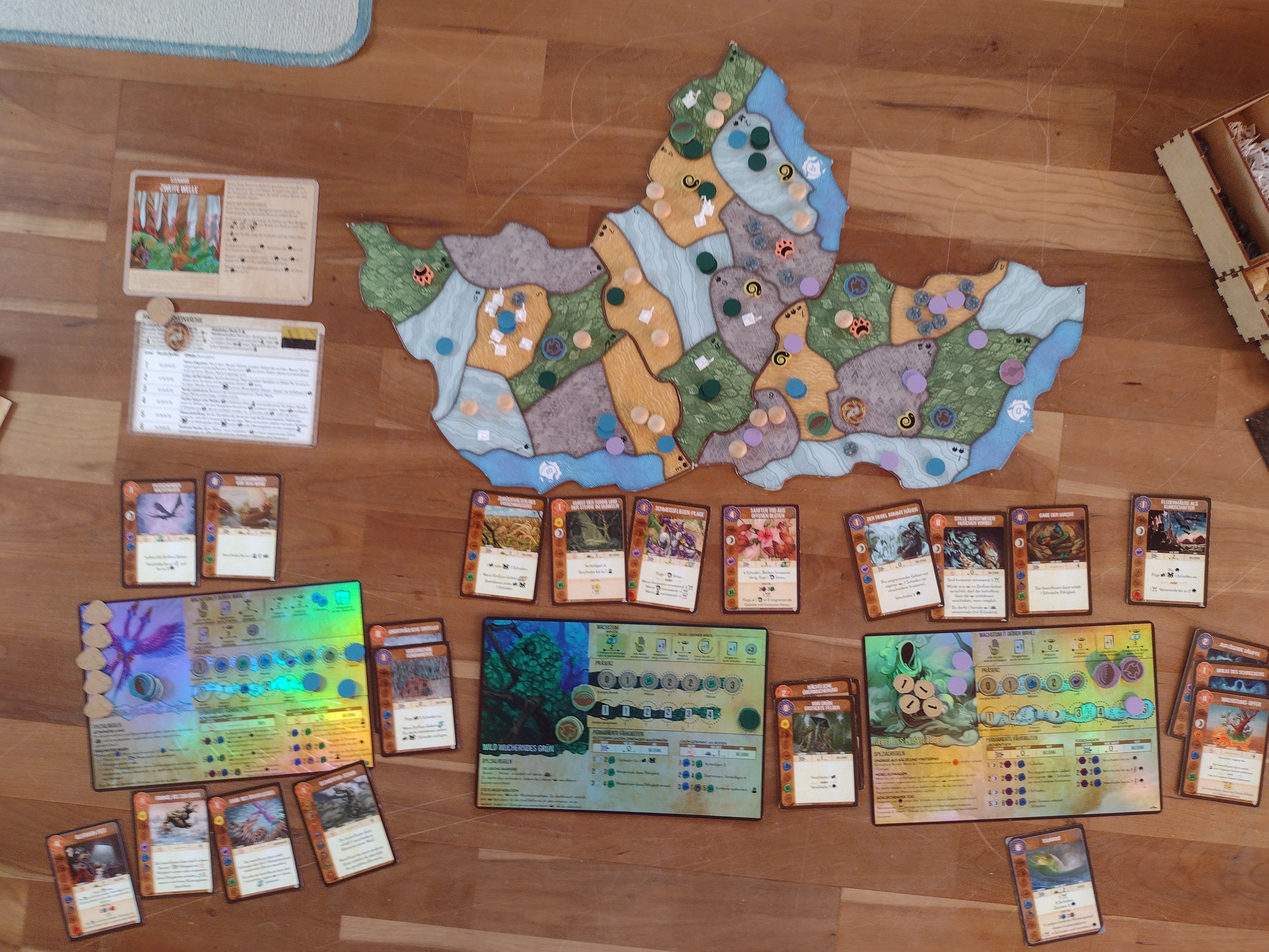 Das Grün hatte es auch relativ schwer zu Beginn, es kamen oft Wüsten und Berge, aber als sich dann der Fokus der Invasoren auf die Dschungel und Küsten änderte, kam das Grün voll in Fahrt. Und am Beginn von Invasorenstufe III, wenn man dann die zurückgelegten Fähigkeiten nutzen darf, konnte ich dann das Spiel auf Furchtstufe II gewinnen.