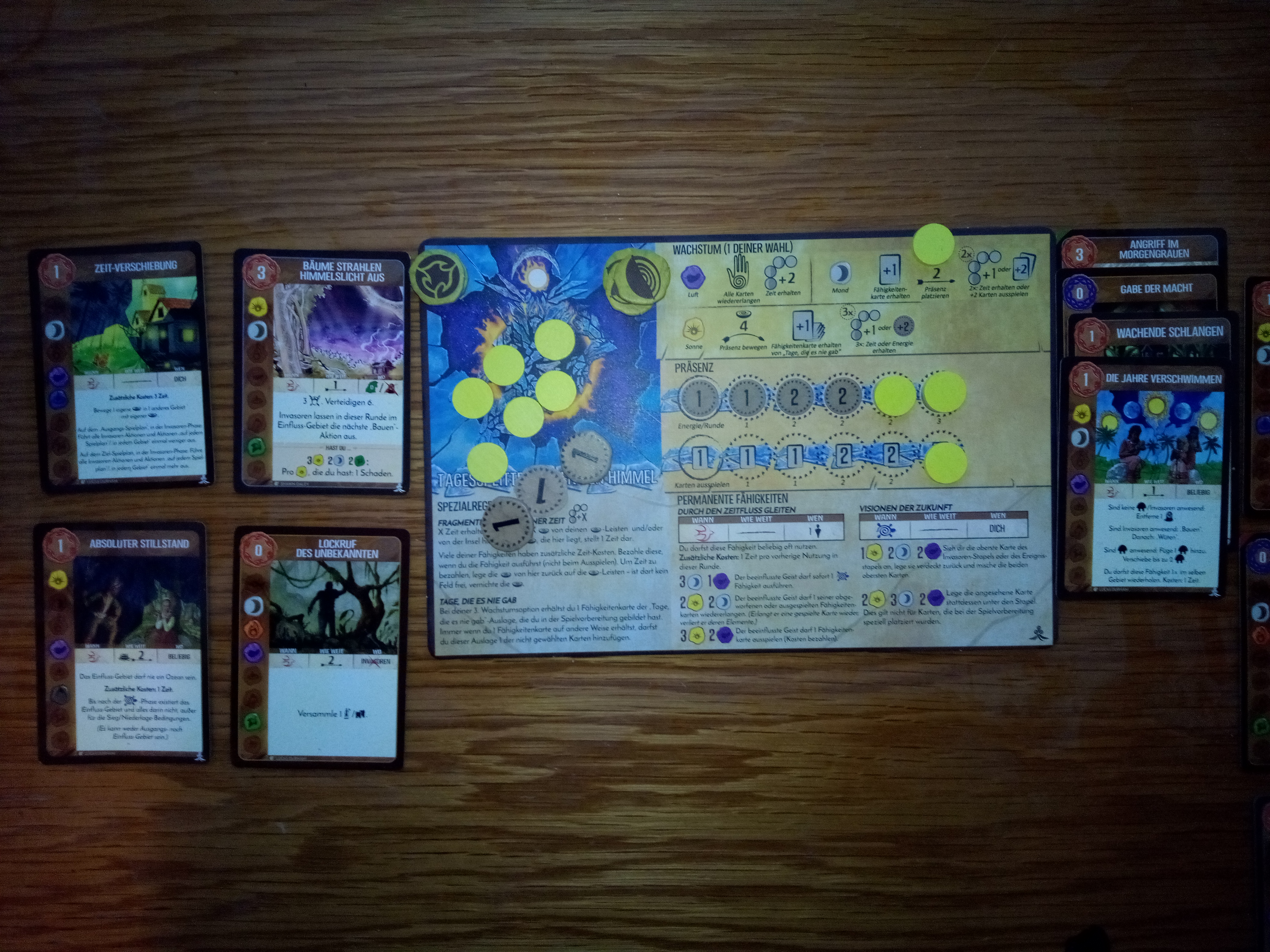 +3 Zeit freischalten: alle Leisten leer, +3 Energie (in Summe 6!), 3 Karten ausspielen.