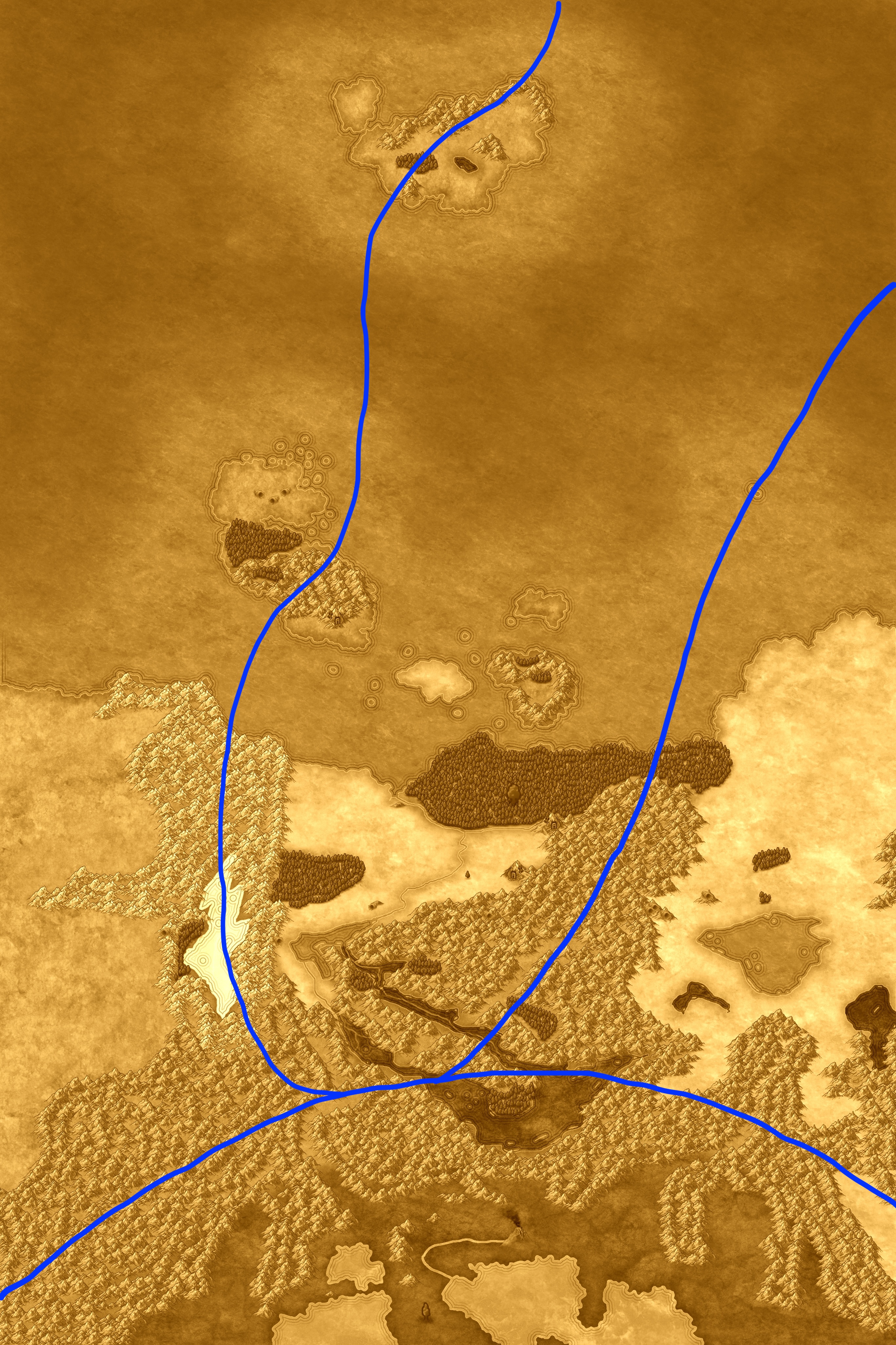 ● Ein bisschen kreativer und potentiell kontroverser ging ich mit dem Gebirge zwischen LddB und Krahd um. Wir wissen jetzt, dass gleich drei Stellen dort Drachenschweif, Drachenbuckel und Drachenschlund genannt werden. Da wollte ich zumindest ausprobieren, ob es möglich ist, die Stelle aus der Vogelperspektive ein bisschen wie einen Drachen aussehen zu lassen, ohne dass es allzu künstlich wirkt. Rückmeldungen äußerst erwünscht!