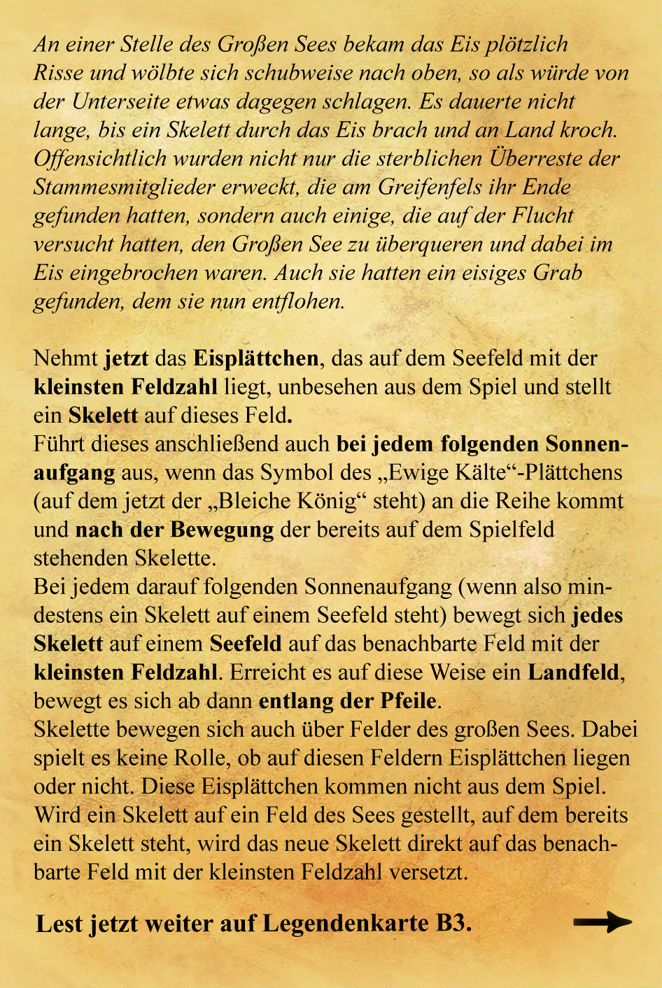 - Das Skelett von Feld 454 überspringt die Kreaturen so weit, dass es unmittelbar vor der Zeltstadt zum halten kommt. Anschließend taucht ein weiteres Skelett auf Feld 456 auf. Das dort befindliche Eisplättchen kommt unbesehen aus dem Spiel.