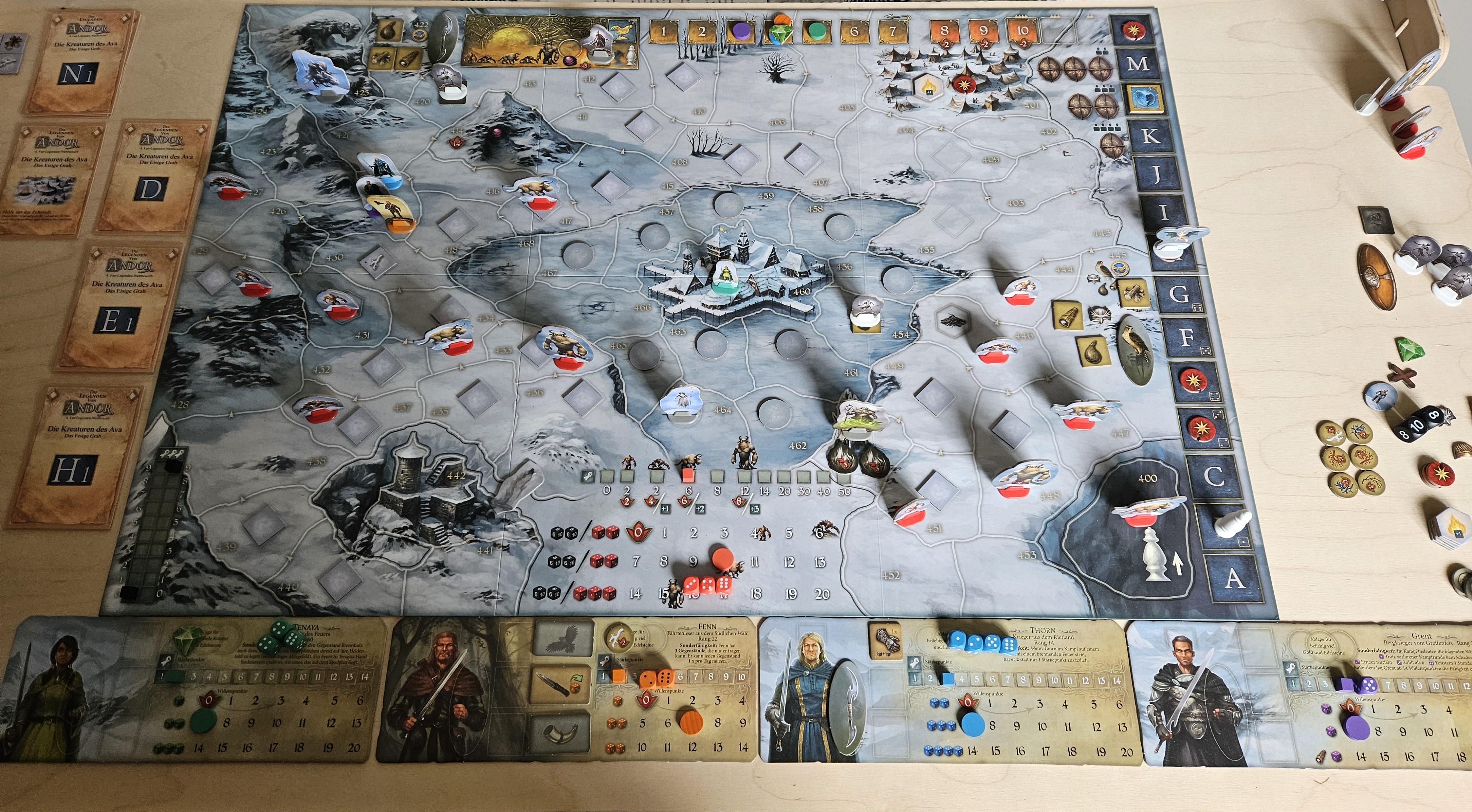 - Das Skelett von Feld 454 überspringt die Kreaturen so weit, dass es unmittelbar vor der Zeltstadt zum halten kommt. Anschließend taucht ein weiteres Skelett auf Feld 456 auf. Das dort befindliche Eisplättchen kommt unbesehen aus dem Spiel.