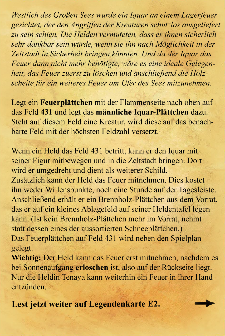 - Auch Fenn bemüht sich, sich und Thorn auf angenehme "Kampftemperaturen" zu bringen und entfacht das Feuer auf Feld 30. Dann lädt er den Krieger zum Kampf gegen den Wargor ein.