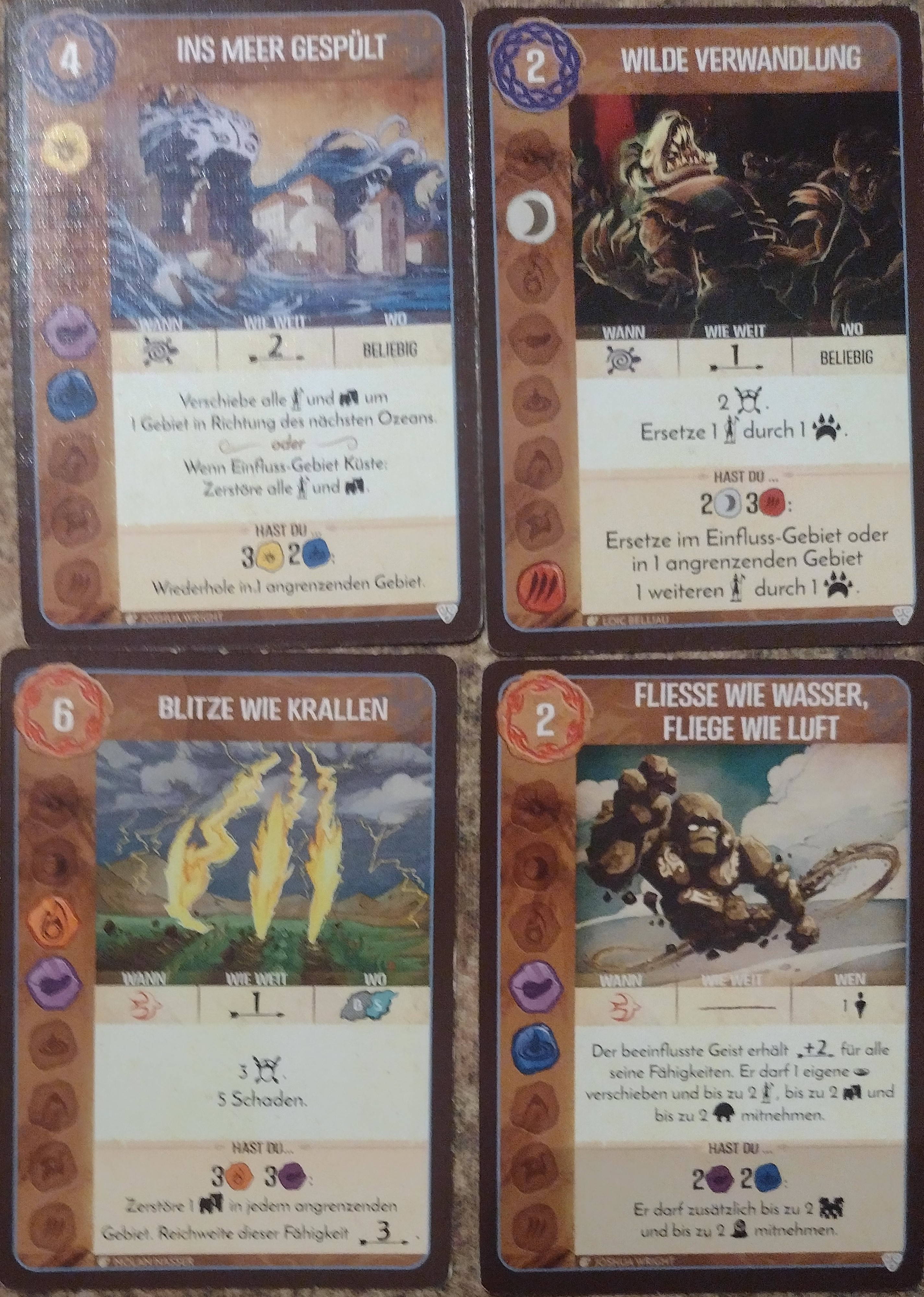- "Extremes Hochwasser" auf A4. Wenn ich durch die "Gabe der Verbindung" 2 Elemente bekommen könnte, würde ich Wasser nehmen und dann das "Hochwasser" auf A4 spielen. Dort werden das Dorf und 1 Entdecker zerstört und der 2. Entdecker nach A2 verschoben. (+2 Furcht)