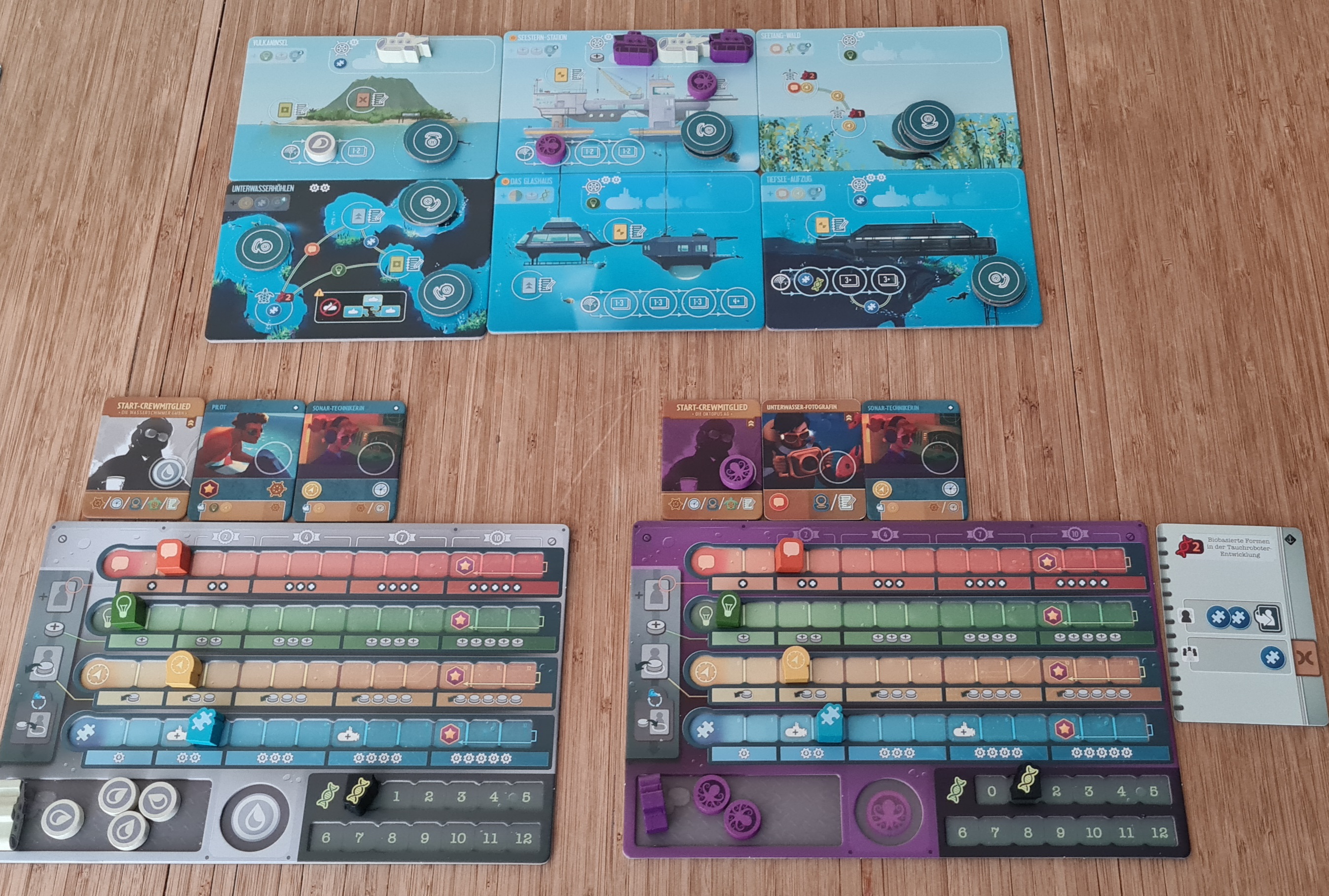 Dann bin ich Startspieler, wähle die Sonar-Technikerin, erreiche Stufe 2 in gelb. Ich bekomme 1 neue Scheibe (grün) und kann 2 Scheiben zurücknehmen (gelb), sodass ich alle meine Crewmitglieder einsetzen kann.