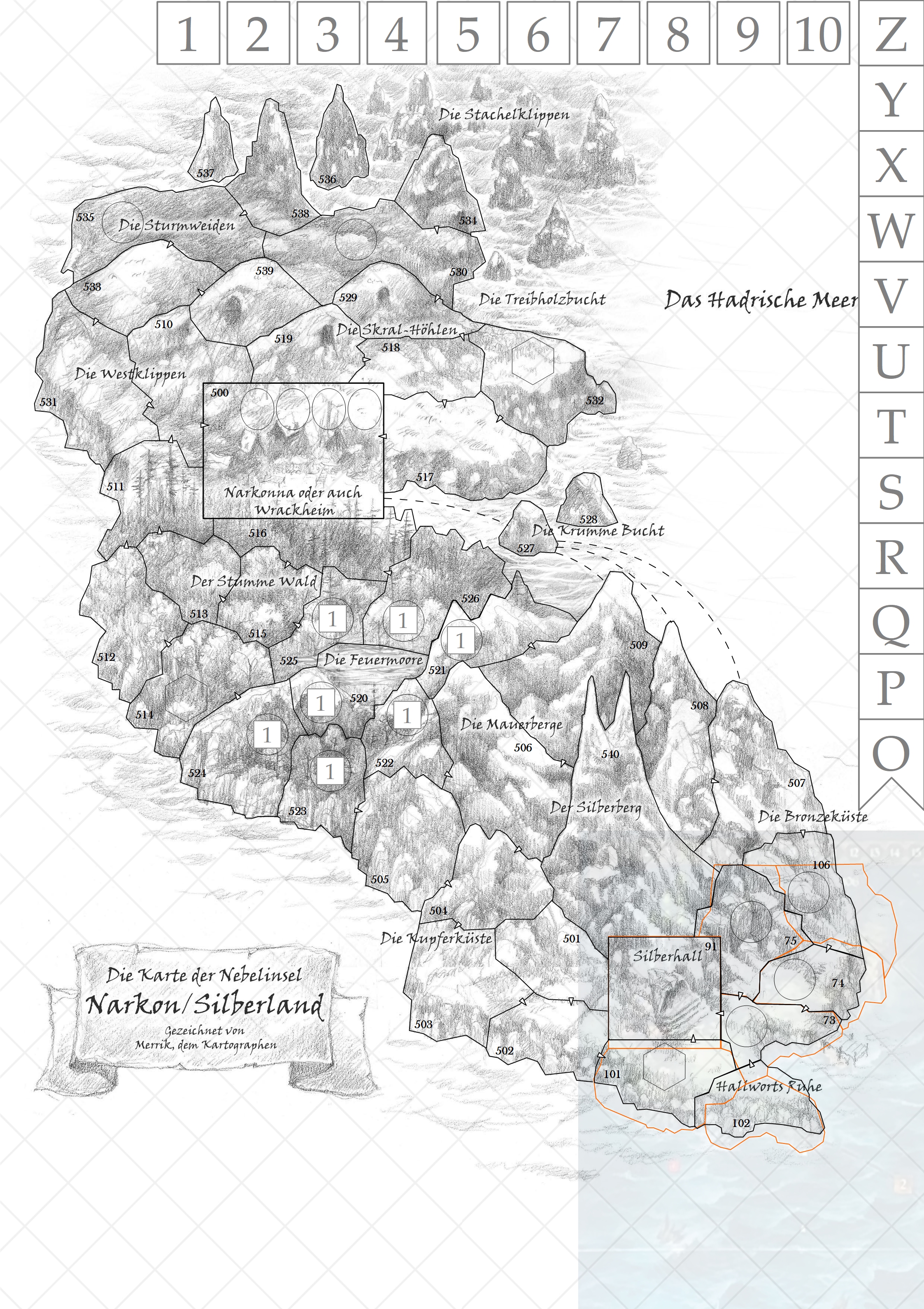 Ich hatte, nachdem sich der Paldor-Thread etwas verlaufen hatte, mal angefangen, an einem eigenen Spielplan für Narkon zu arbeiten. Ich habe auch Skizzen für neue Mechaniken und einige Legenden gemacht, aber falls da überhaupt mal irgendetwas fertig wird, vergeht bestimmt noch eine halbe Ewigkeit. Daher poste ich hier mal, wie weit ich gekommen bin; vielleicht dient es ja jemanden als Inspiration. :-)