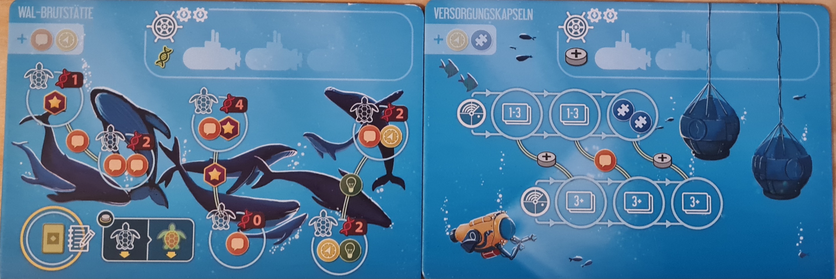 Die Wal-Brutstätte kenne ich, die ist absolut genial. Aber ich bin mir nicht sicher, ob ich nicht besser die Versorgungskapseln wähle. Sonar brauchen wir ja schließlich doppelt (für neue Zonen und das Ziel), und wir bekommen da eine Scheibe (ok, bei der Wal-Brutstätte bekommen wir 1 Wissen, auch nicht schlecht,aber dafür fürchte ich, werden uns allen außer dem Troll die Scheiben ausgehen).