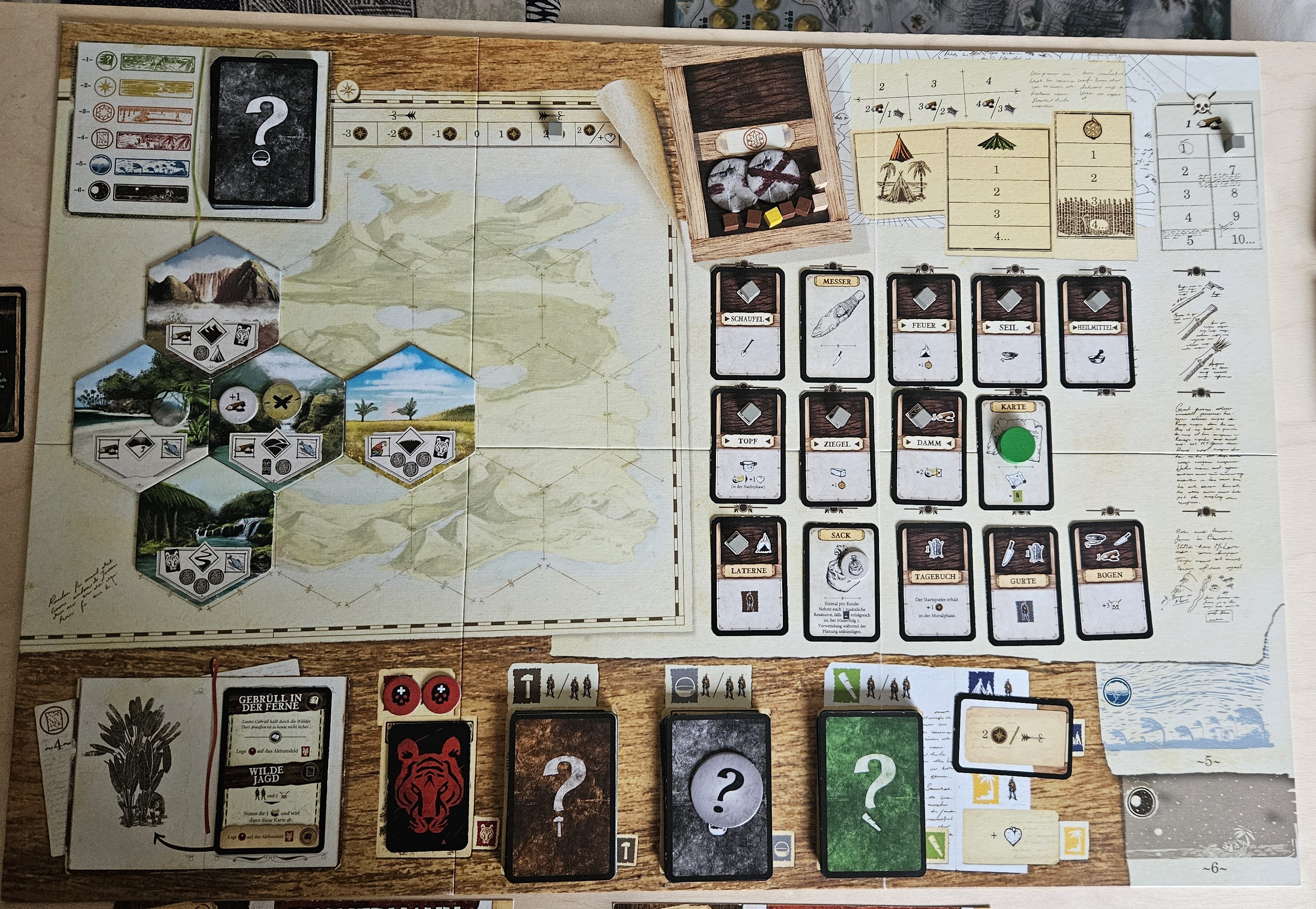 Ludwig war zufrieden mit dem bisher Erreichten und beschloss, zum Lager zurückzukehren. Marie-Catherine hingegen zog es weiter in unerforschte Territorien. Vom Gipfel eines Hügels aus blickte sie in die Ferne in mehrere Gebiete und entschied sich dafür, in eine in eine Steppe jenseits der Hügel mit dem Lager vorzudringen. Auch hier bot ihr ihre selbstgefertigte Karte einen großen Nutzen. In der Steppe entdeckte sie ein wildes Tier (kann aber auf die Entfernung nicht genau erkennen, um was für ein Tier es sich handelt), fand ein paar Heilkräuter (da zeigten sich ihre botanischen Kenntnisse) und stieß plötzlich mit einem Fuß gegen einen herumliegenden Degen (wo immer der auch herkam), den sie natürlich einsteckte.Die Forscherin setzt mit 2 Eps ihre Fähigkeit "Aufklärung" ein und zieht die nächste 3 Inselteile.