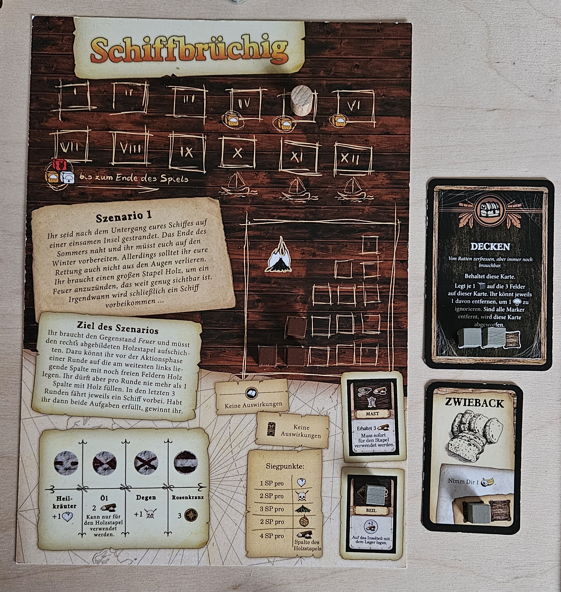 ...mit einem "Sturm" (eine der grauen Abenteuerkarten, die in den Ereignisstapel gemischt wurden). Dadurch wird das Sturmplättchen auf das Wetterfeld gelegt. Wenn wir zur Wetterphase kommen, wird zum einen ganz normal der Regenwürfel geworfen. Zusätzlich müssen wir jetzt auch noch auf einen Sturm achten. Durch den Sturm müssen wir in der Wetterphase unsere Palisadenstärke um 1 verringern. Können wir das nicht, erleiden alle Charaktere 1 Wunde. Aktuell beträgt unsere Palisadenstärke 0.