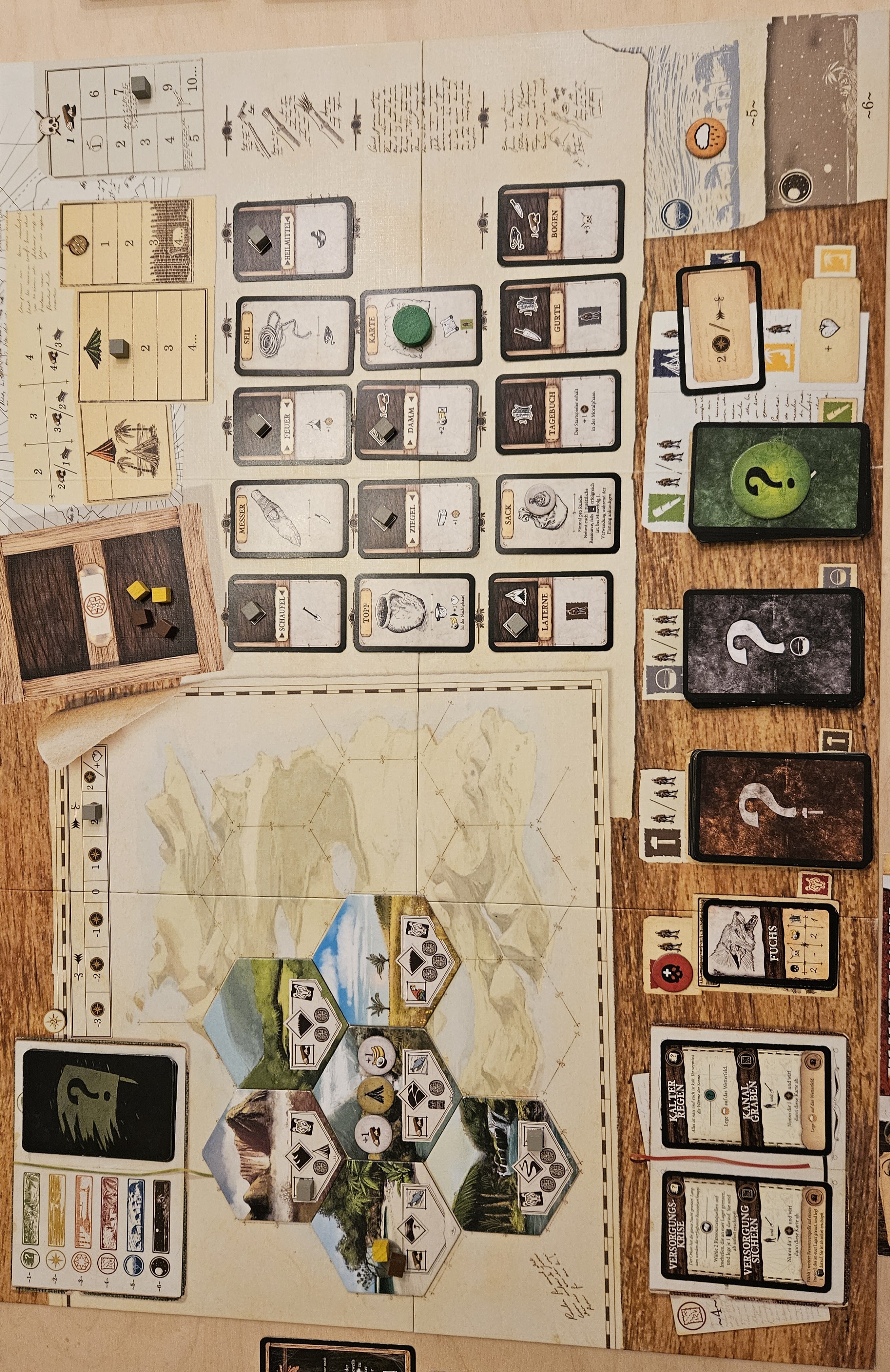 Zur Wiederholung: Das Buch-Symbol können wir ignorieren. Jetzt müssen wir uns entscheiden, welche Ressourcenquellen auf Inselteilen angrenzend zu den Hügeln (wo unser Lager liegt) wir mit grauen Markern abdecken wollen. Dort können wir ab jetzt keine Ressourcen mehr sammeln. Ich wäre für die beiden Steppengebiete, also eine Holzquelle und eine Nahrungsquelle.