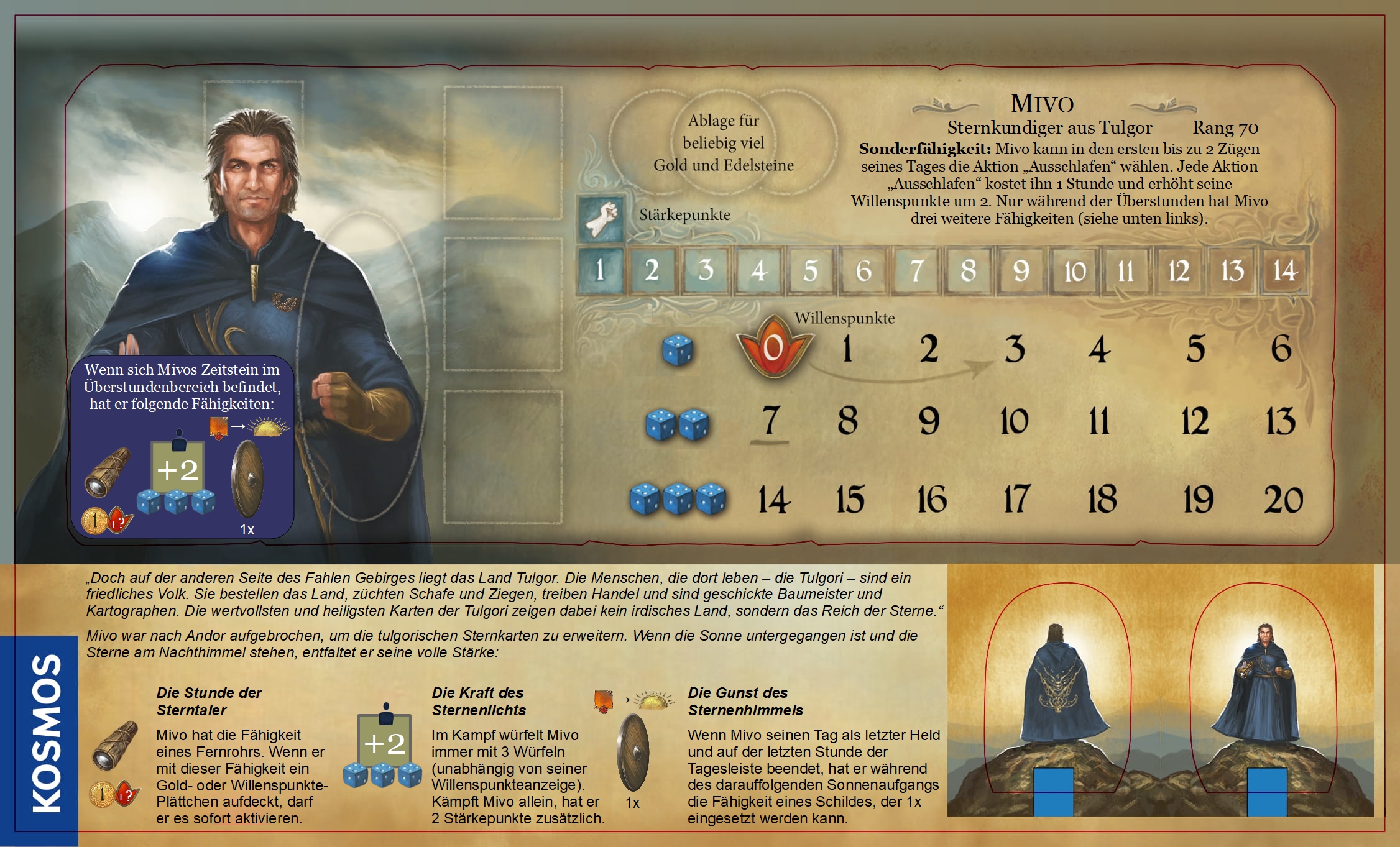 Am Sternkundigen habe ich am längsten getüftelt, weil der ja meine ganz persönliche Andor-Version darstellt. Die zweite SF ist kurz gesagt OP, man will ja selbst auch immer der größte Held sein. ;-) Spaß beiseite, man kann Mivo zu Anfang der Legende auch nur einen bereits auf die Rückseite gedrehten Sternenschild geben, um es sich nicht ganz so einfach zu machen.