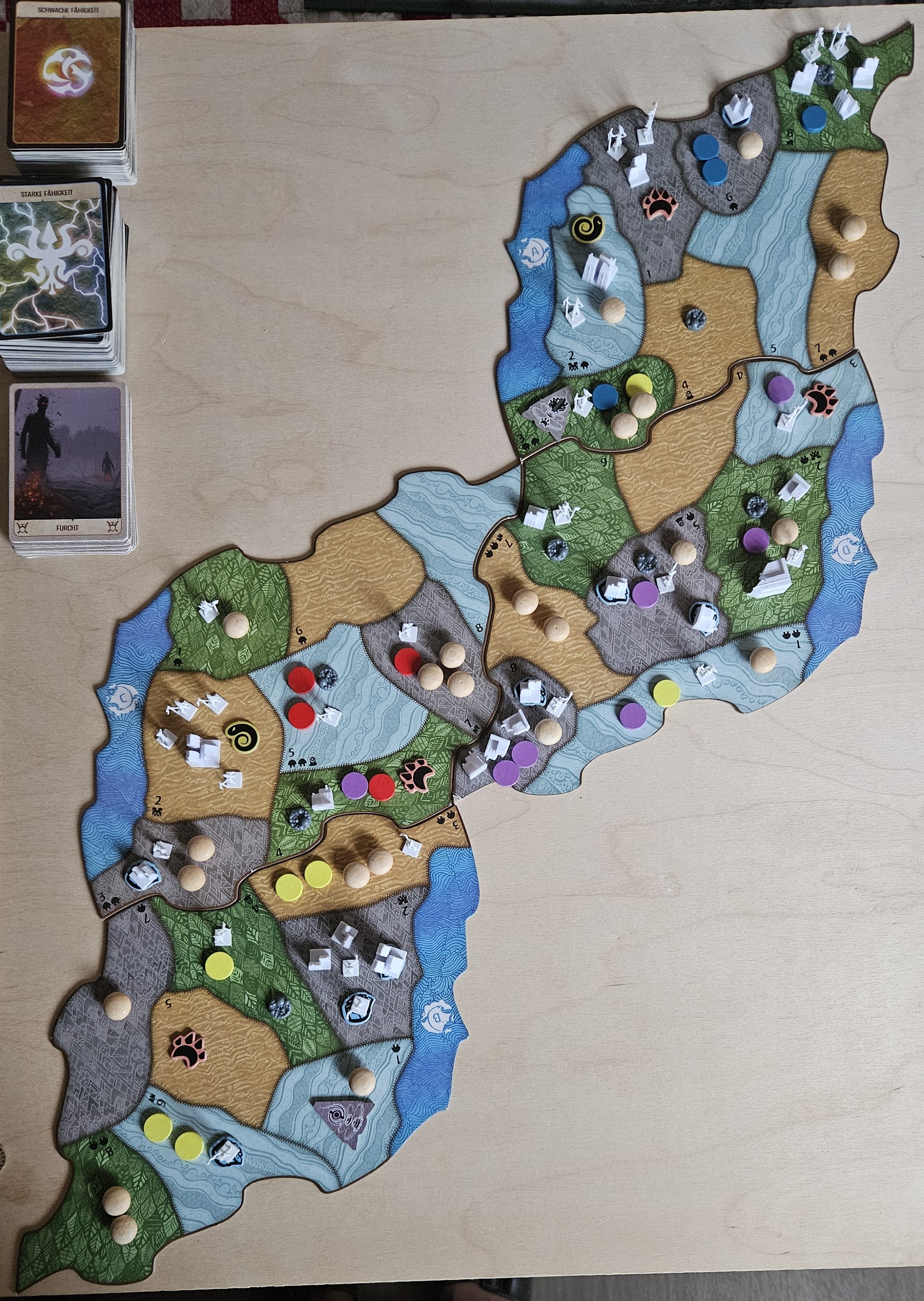 Das Wispern schickt sein Inkarna nach D8, setzt einen Streitmarker unter ein angeschlagenes Dorf, wir verschieben das Dorf nach C4