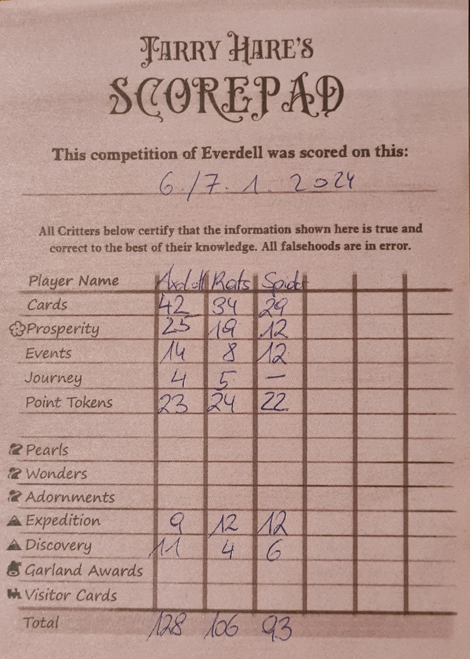An dieser Stelle kann ich auch noch einen kurzen Everdell-Bericht nachreichen. Am 31.12. spielten wir eine Partie mit unserer "Lieblingskombination", bestehend aus dem Grundspiel, Bellfaire und Spirecrest plus die Legendary Cards sowie die Tickets und die neuen Handkarten aus Newleaf. Es traten an die Frettchen gegen die Starlings.