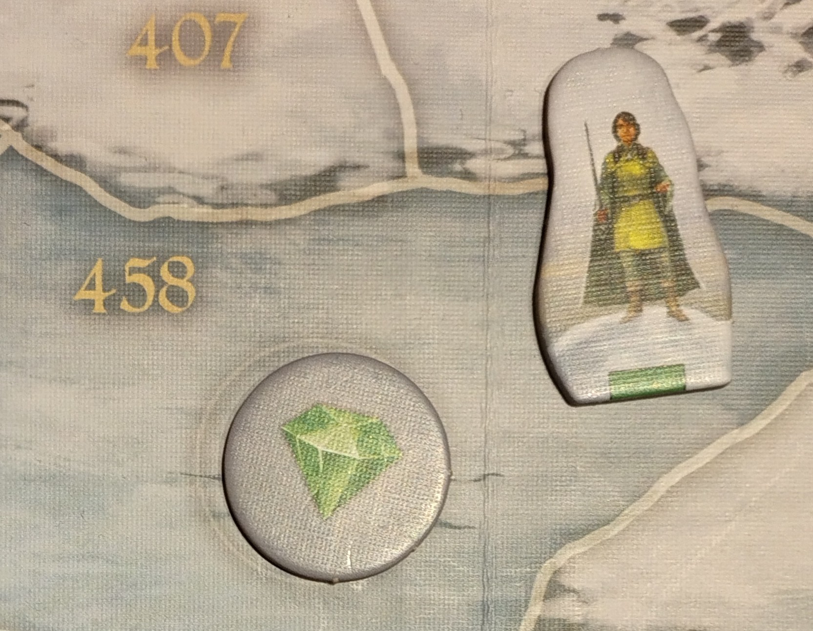 Es sind Zielmarker bei den Grehon, auf auf Feld 438 und in der Pfahlbausiedlung. Wenn wir so ein Feld betreten, wird eine Karte vorgelesen. Der Zielmarker wird dann wie ein Kraut eingesammelt und kann auch mit dem Falken verschickt werden. Wenn ein Held alle drei hat, wieder die Karte „Die Erkenntnis“ vorgelesen.