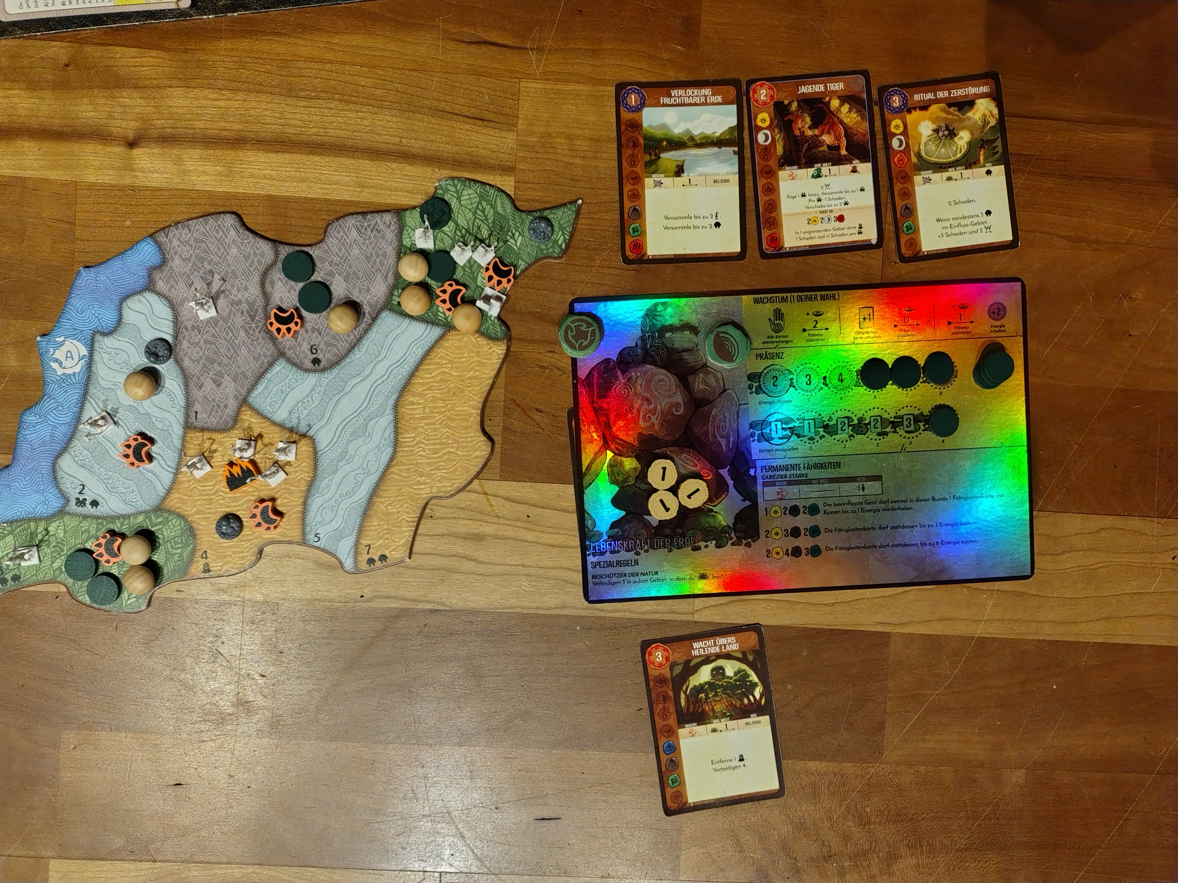 Ob die neuen Ereigniskarten jetzt so viel hilfreicher sind als die alten, kann ich nicht so direkt sagen. Die Dahan-Effekte sind auch auf anderen Karten vorhanden. Ein Effekt, der einfach so eine Bestie auf jeden Spielplan hinzufügt, gab es schon auf einer Katze aus A&T. Die unregelmäßigen Ausbrüche gibt es ebenfalls, lediglich das zerstörte Ökosystem, das eine Einöde in ein Gebiet mit Ödnis hinzugefügt, ist neu. Finde ich aber jetzt nicht zu stark oder so, auch andere Effekte machen mal ein bisschen Schaden. Auch die Plättcheneffekte finde ich also ganz normal. Die zugezogenen Siedler (1. EK) sind quasi Schottlands Eskalationseffekt. Nicht wirklich hilfreich. Die weit entfernten Kriege ersetzten eine Karte, die in deinem Spiel bereits vorkomm. Ich weiß nicht, wie genau die hieß, aber im Endeffekt hat sie in einem Küstengebiet Schaden an Land und Invasoren in Höhe der Kosten einer zufälligen starken Fähigkeit gemacht (aus A&T). Die wurde regebalanced, weil die ursprüngliche Version zu stark war. Wir zerstören also jetzt die Hälfte der Gebäude für 2 Ödnis anstatt dass wir für eine Ödnis 2-9 Schaden machen. Nicht schlecht, aber weniger hilfreich, als die alte Karte. Die letzten Karte kostet jeden Geist entweder eine Präsenz und eine Energie oder erlaubt es, eine Karte (keine starke Fähigkeit) gratis auszuführen, wenn man diese vergisst und seine Hand ablegt. Auch eher negativ, wenn man nicht zufällig vorhat, seine Hand im nächsten Zug aufzunehmen.