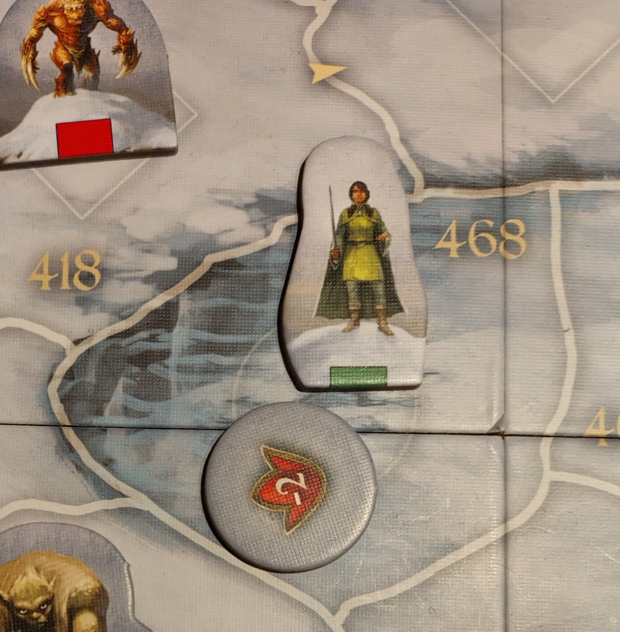 -Thorn bekämpft die Myrk: Mit den Kräuter würfelt er eine 10, insgesamt Kampfwert 21. Die Myrk wehrt sich verzweifelt (gewürfelte 6), aber 20 reicht ihr nicht. Thorn schubst sie vom Spielplan (6.h)