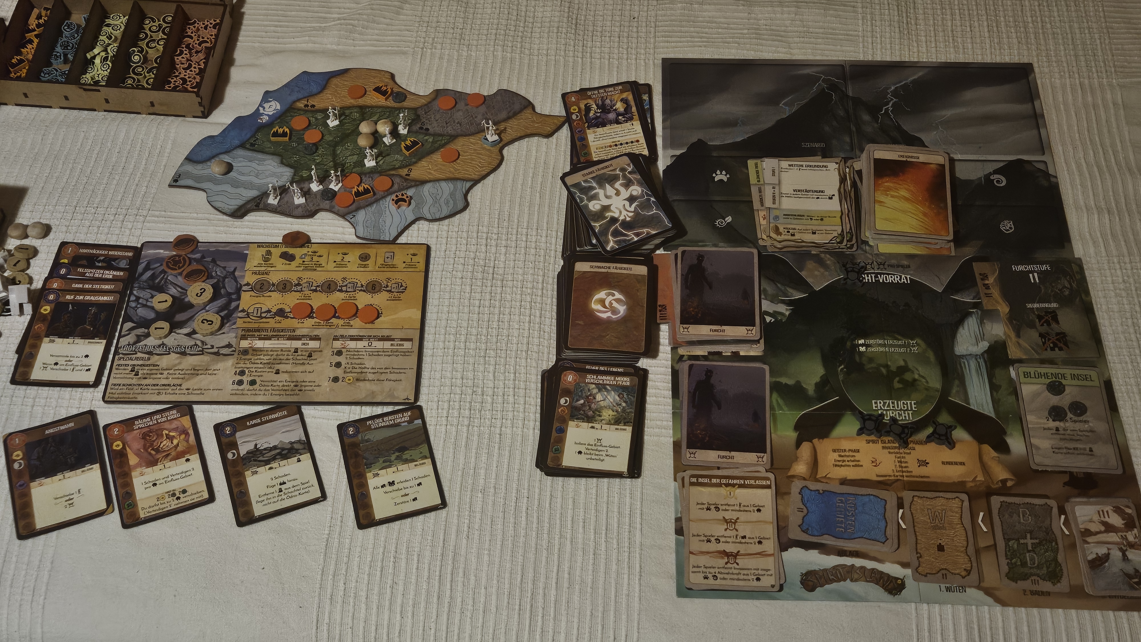 Beim zweiten Spiel habe ich gezielt beide Feuer bereits nach 2 Runden freigeschaltet. Da hatte ich aber brutal Glück mit den Invasorenkarten. So hatte ich nie eine Ödnisausbreitung.