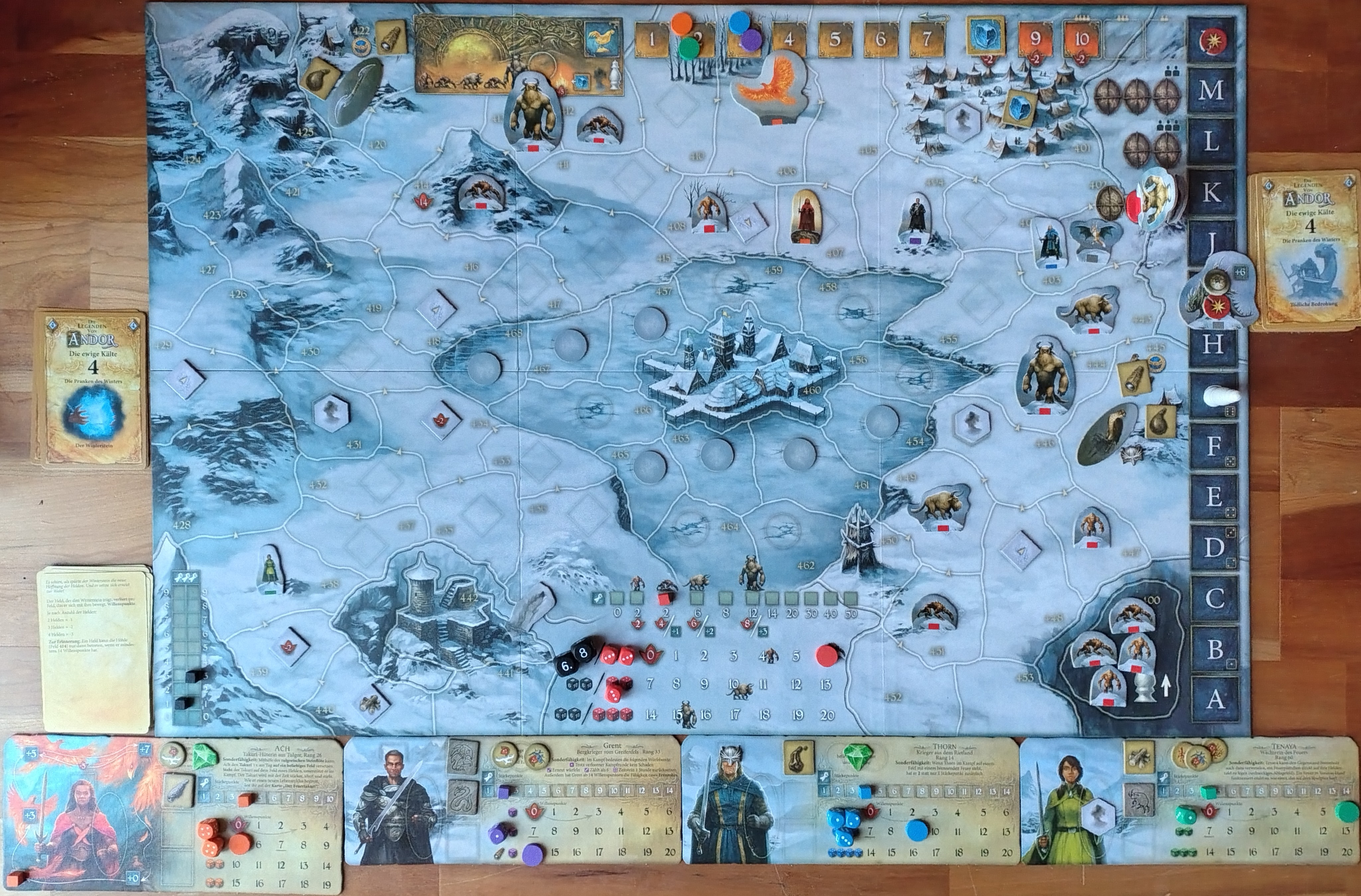 Wenn wir ab jetzt ein Schneeplättchen mit Sternchen aufdecken, wandert die Legendenkarte ein Feld nach unten. Ein Tipp weißt uns darauf hin, dass wir uns besser auf die Bedrohung vorbereiten können, je eher wir wissen, was uns dort erwartet.