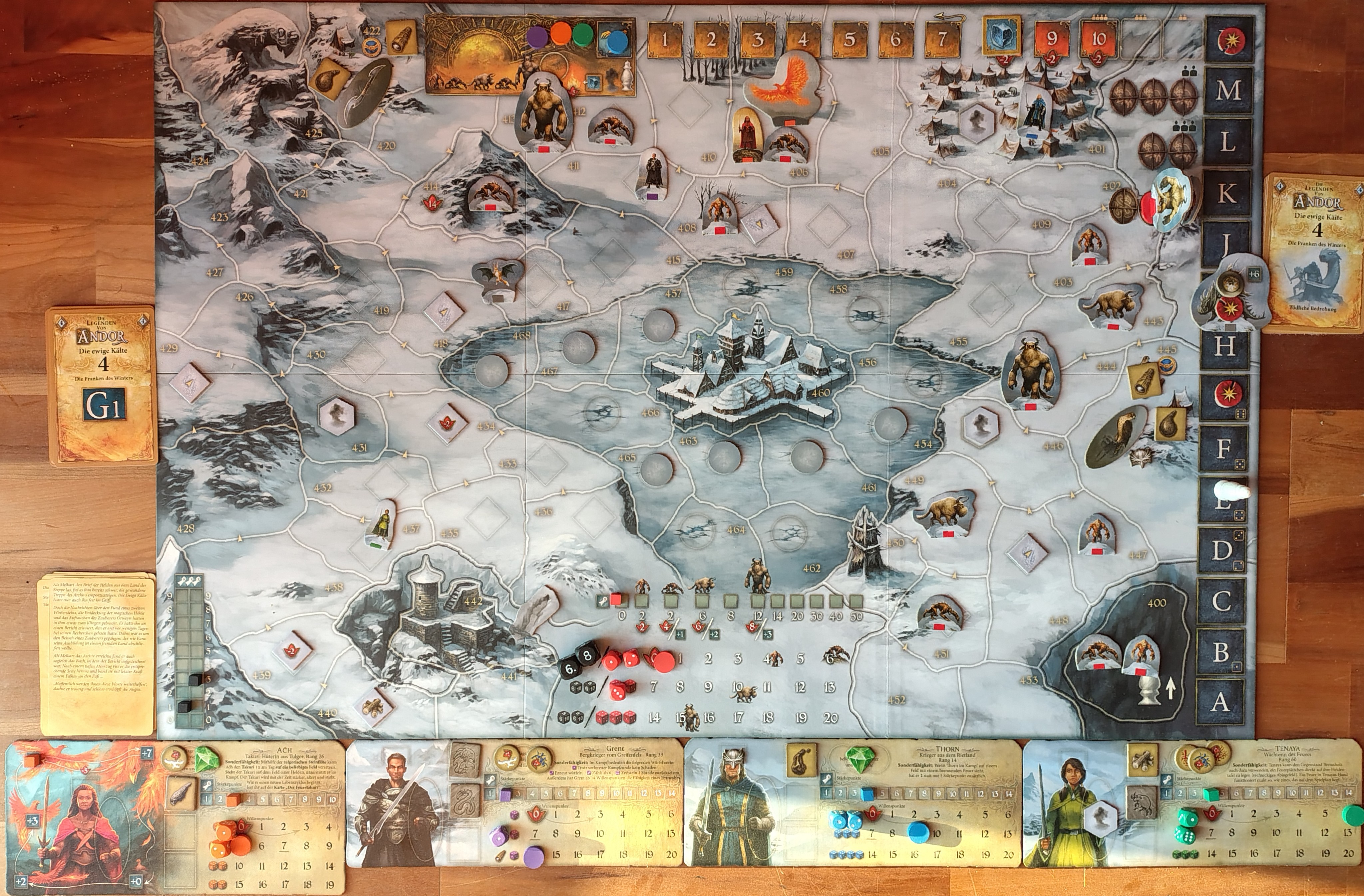 Wenn wir ab jetzt ein Schneeplättchen mit Sternchen aufdecken, wandert die Legendenkarte ein Feld nach unten. Ein Tipp weißt uns darauf hin, dass wir uns besser auf die Bedrohung vorbereiten können, je eher wir wissen, was uns dort erwartet.