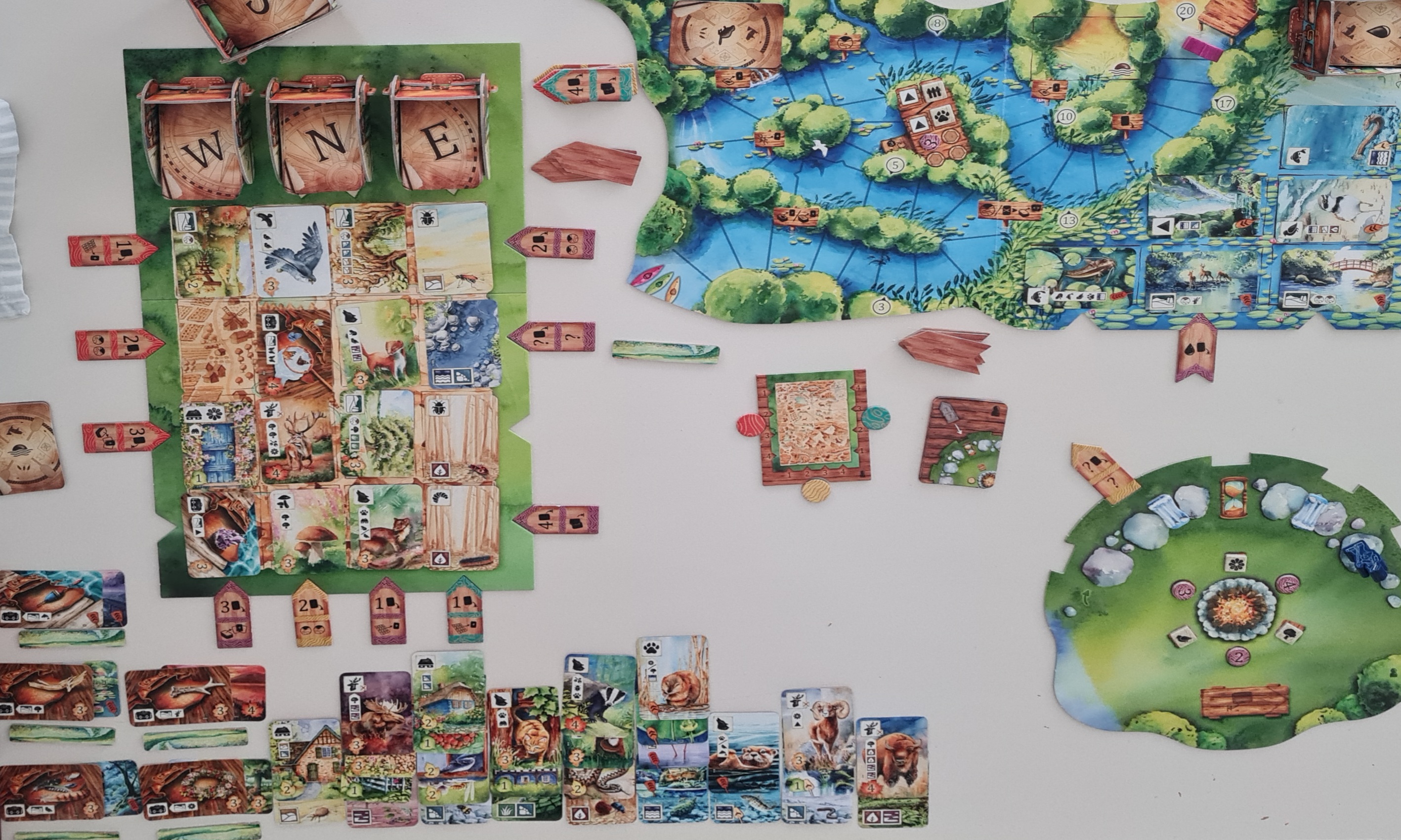 Im Abenteuerbuch hat man auch drei Bereiche, in denen man seine Zielmarker mit den Siegpunkten 2, 3 und 4 legen kann, bei Raubtier, Raubvogel und Hirsch, wobei man dieses und entweder das rechte oder das linke Symbol in seiner Wanderung auf der jeweils richtigen Seite der Flusstafel liegen haben muss! Das Spiel ist also durchaus knifflig, aber, wieder einmal, wunderschön.
