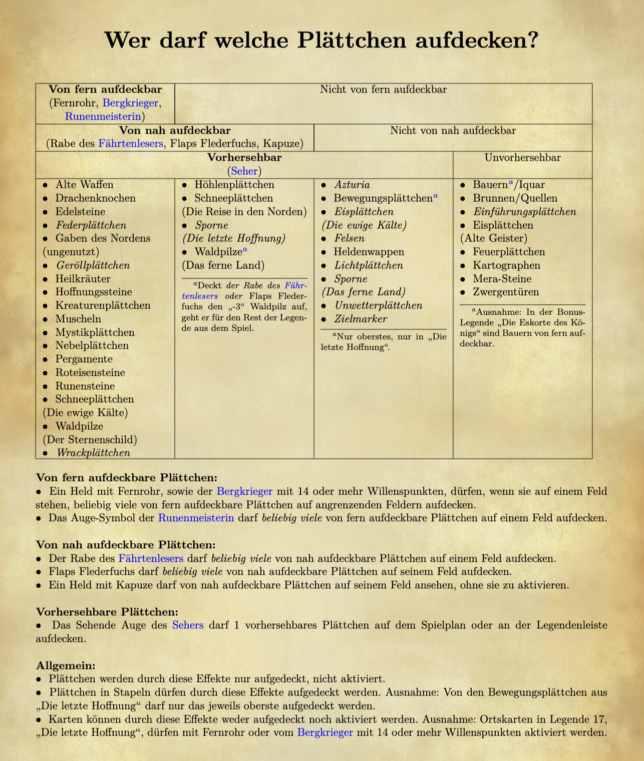 Mivo hat geschrieben:Ich würde Eisplättchen definitiv eine Spalte nach links schieben, weil sie intuitiv in dieselbe Kategorie wie Schneeplättchen und Höhlenplättchen fallen. Das würde es auch leichter machen, sich die Regeln zu merken.