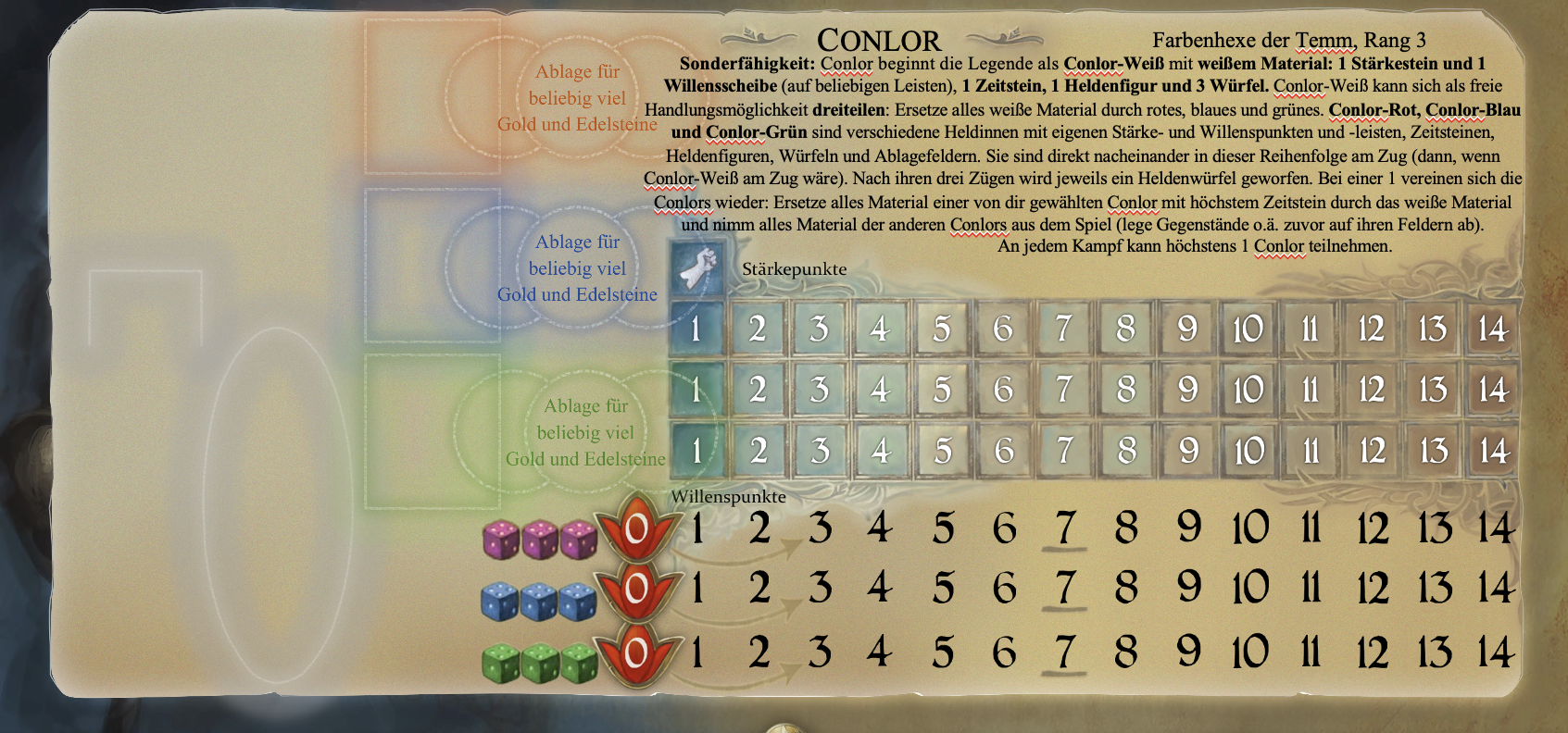 Die Heldentafel hat gewöhnlich viele Ablagefelder, aber jeweils 3 Stärkeleisten bis je 6 SP statt 1 Stärkeleiste bis 14 SP. Dort drauf werden mit 3 Stärkesteinen die Stärkewerte der drei verschiedenen Figuren angezeigt: Die Fremde, der Fremde und der Silberhirsch.