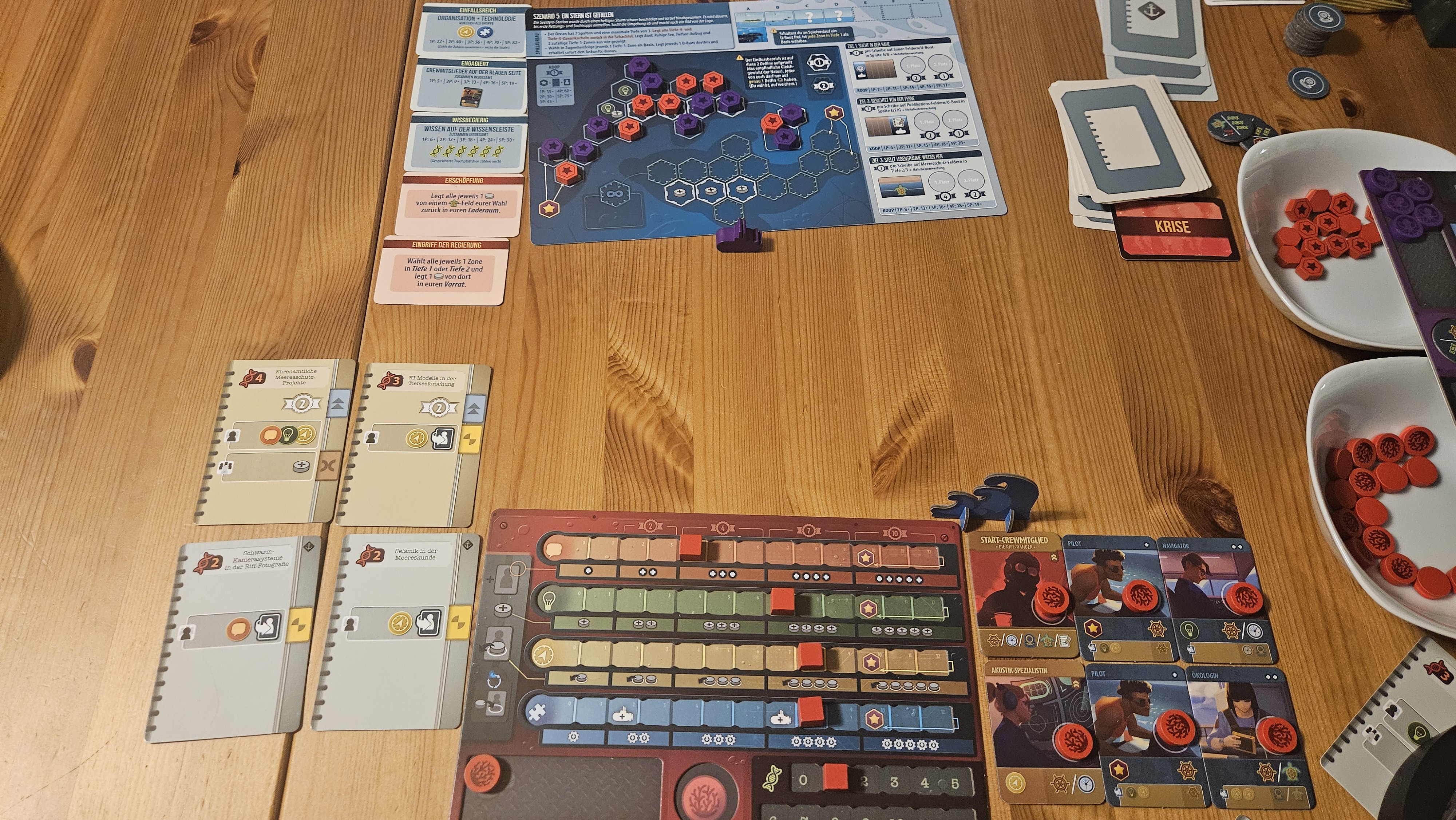Publikationen und Schiffe: wenn der Tsunami kommt, dann nein. Wenn nicht, könnten wir es schaffen, aber! Aber auf Kosten des Bonusziels 12 Wissen, weil wir hatten von Anfang an nur die teuren Publikationen, die uns keinen Bonus für den anderen Spieler bringen.