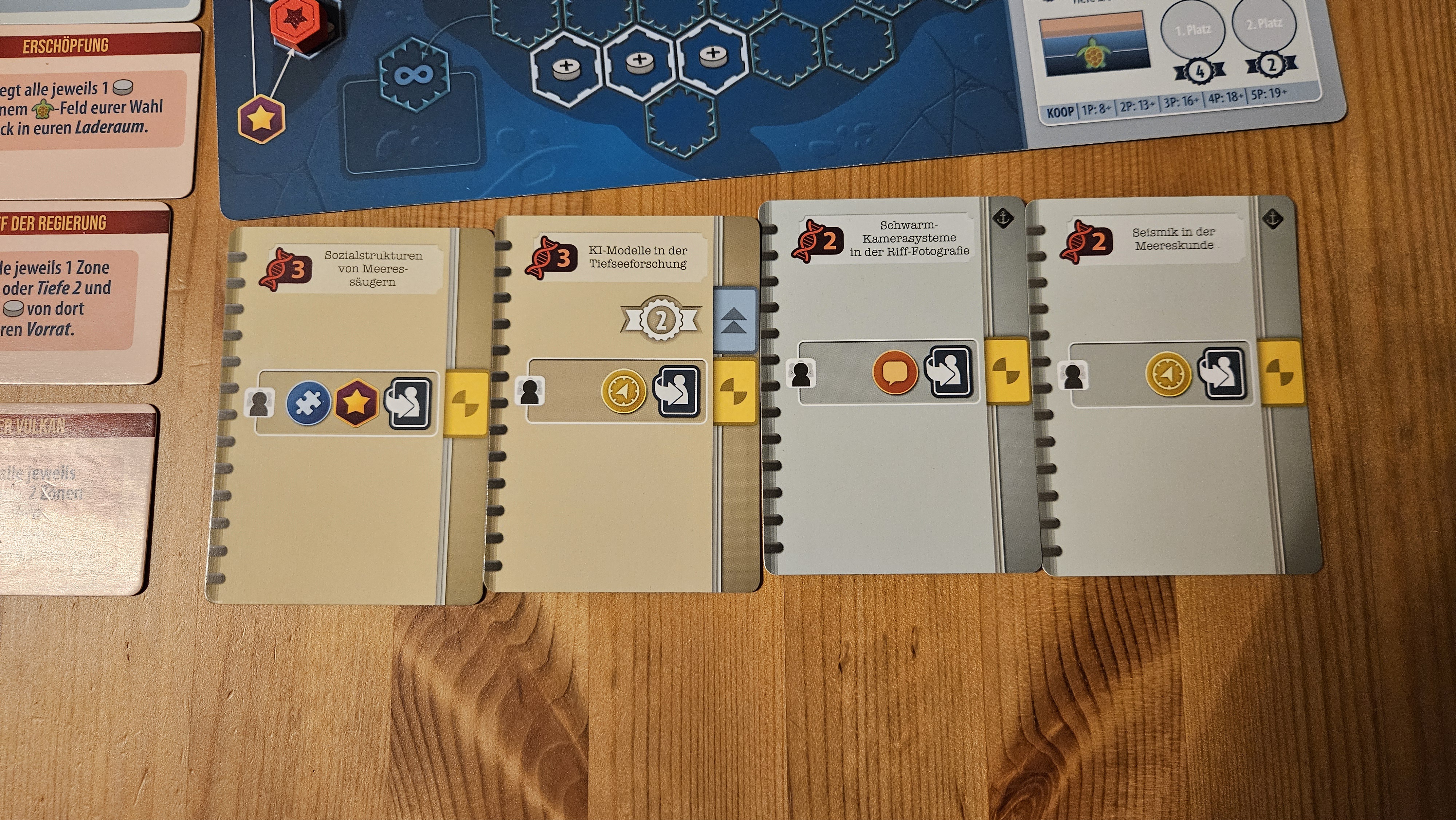 Dann nehm ich die Ehrenamtlichen Meeresschutzprojekte für 4 Wissen, 2 Punkte, gibt mir +1 auf rot, grün, gelb, 1 Stern auf unendlich, weil gelb auf 10, du bekommst eine Scheibe dazu und deckst eine neue Publikation auf