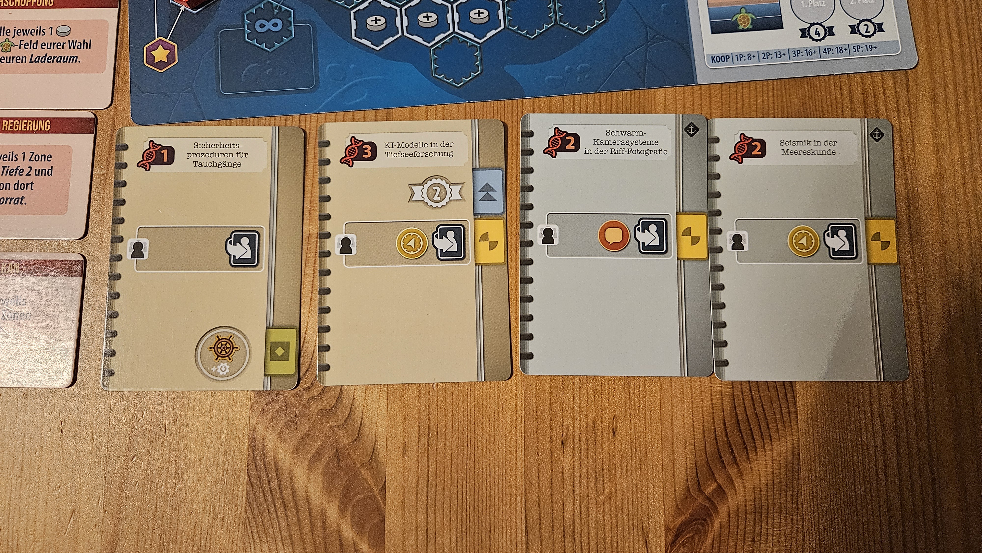 Dann nehm ich die Ehrenamtlichen Meeresschutzprojekte für 4 Wissen, 2 Punkte, gibt mir +1 auf rot, grün, gelb, 1 Stern auf unendlich, weil gelb auf 10, du bekommst eine Scheibe dazu und deckst eine neue Publikation auf