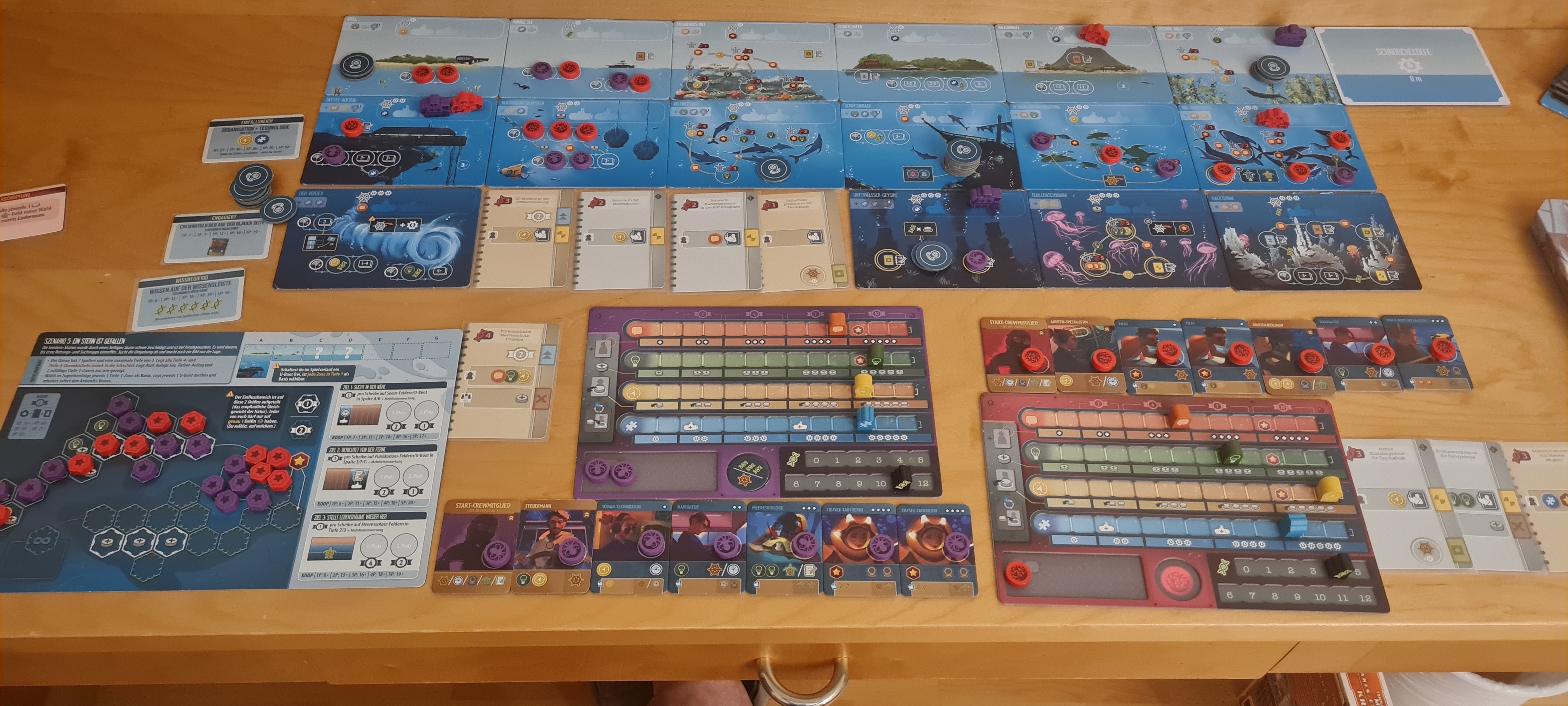 Insgesamt merke ich natürlich, dass ich in Endeavor - Die Tiefsee noch nicht genügend Erfahrung habe. Es gibt eine Vielzahl von Möglichkeiten, da habe ich nicht immer alles im Blick. Dazu merke ich auch, dass trotz Brille der Blick auf den Spielplan sehr anstengend ist. In Kombination mit dem Schreiben der Züge wird es für den alten mann manchmal sehr anstrengend :lol: Dazu kommt noch die Wärme und die Matschbirne von der Arbeit...na ja alles Ausreden :lol: