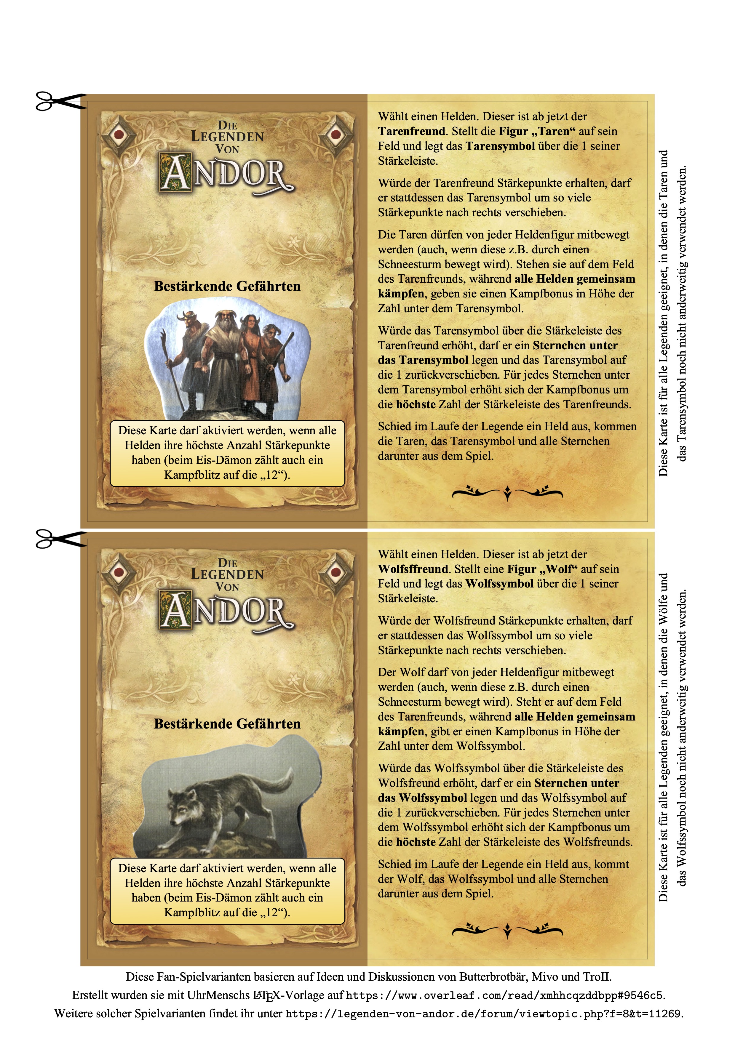 Alle Helden überallDieses zugegebenermaßen nur bei ganz bestimmten Heldenkombinationen und Legenden auftretende Problem würde ich gerne möglichst einfach mit einer Fan-Spielvariante lösen. Statt manuell jede einzelne mögliche Kombination von Held*innen mit verkürzten Stärkeleisten und Legenden mit starken Gegner*innen durchzudenken, wo so etwas vorkommen könnte, und ob jeweils eine Anpassung nötig oder wünschenswert wäre, würde ich gerne einfach eine oder mehrere generische Fan-Spielvarianten formulieren, welche primär in solchen Momenten einen Effekt haben und die nötigen Kampfboni darbringen kann.