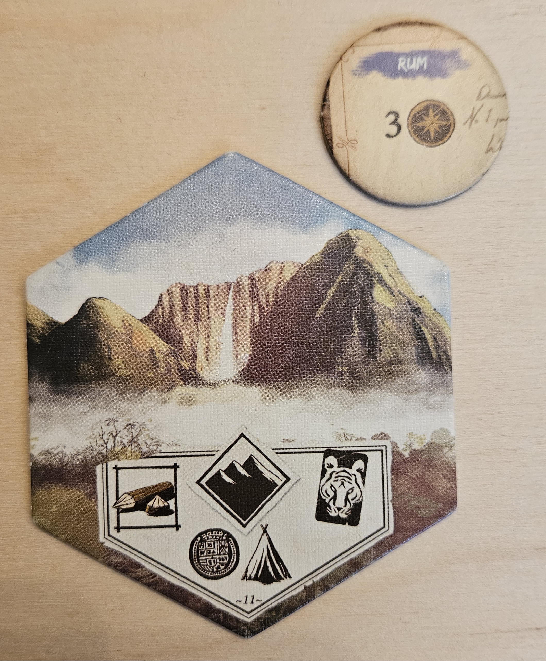 Die Forscherin setzt 1 Aktionsstein sowie den grünen Stein von der "Karte" ein und erforscht den Südwesten. Sie würfelt mit den grünen Abenteuerwürfeln und erzielt einen Erfolg, muss aber eine Abenteuerkarte ziehen. Darauf folgend wird das nächste Inselteil (Berge) aufgedeckt, das 4. Totemsymbol kommt zum Vorschein, eine weitere Tierkarte kommt auf den Jagdstapel und es wird 1 Entdeckungsplättchen gezogen.