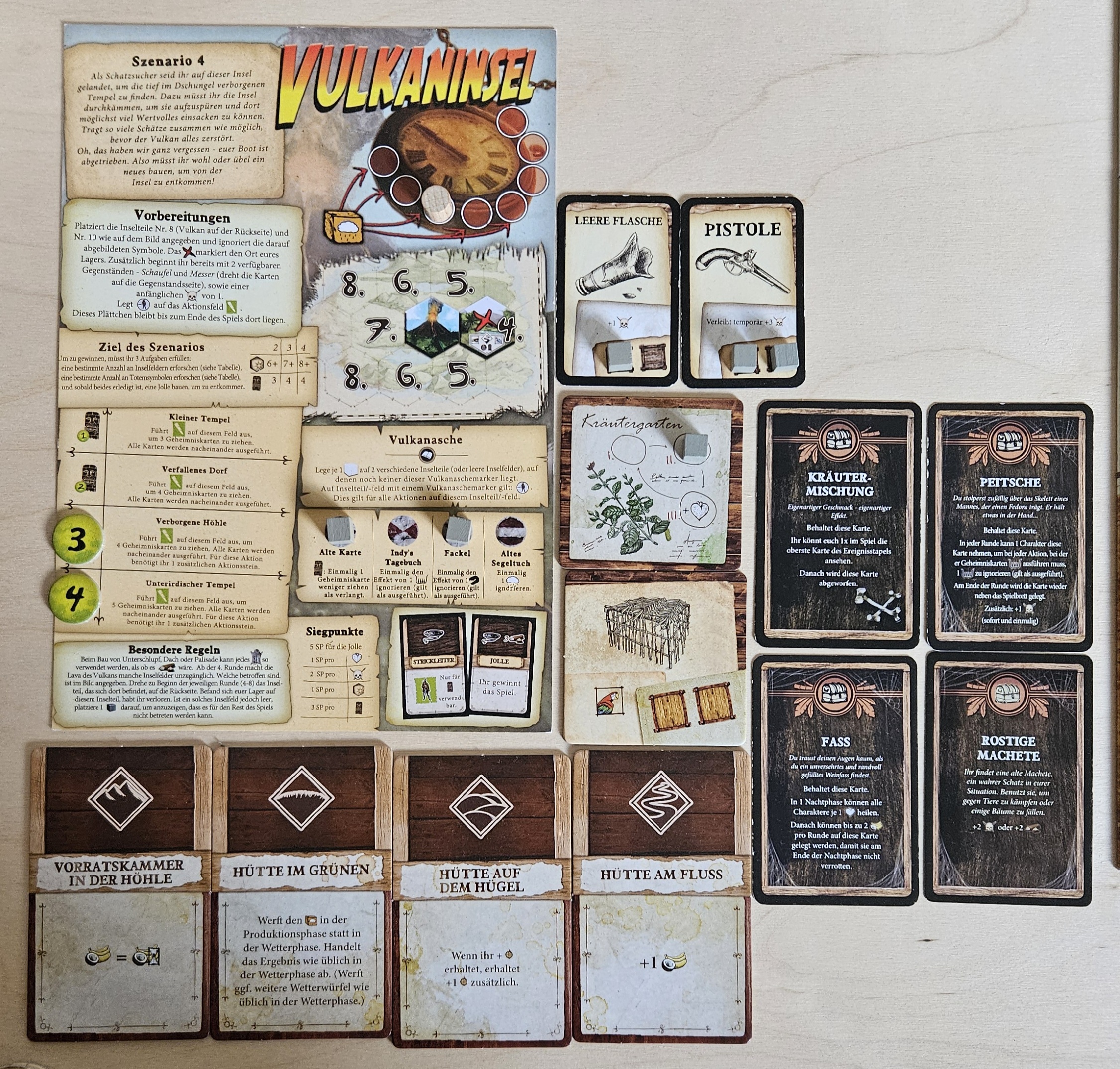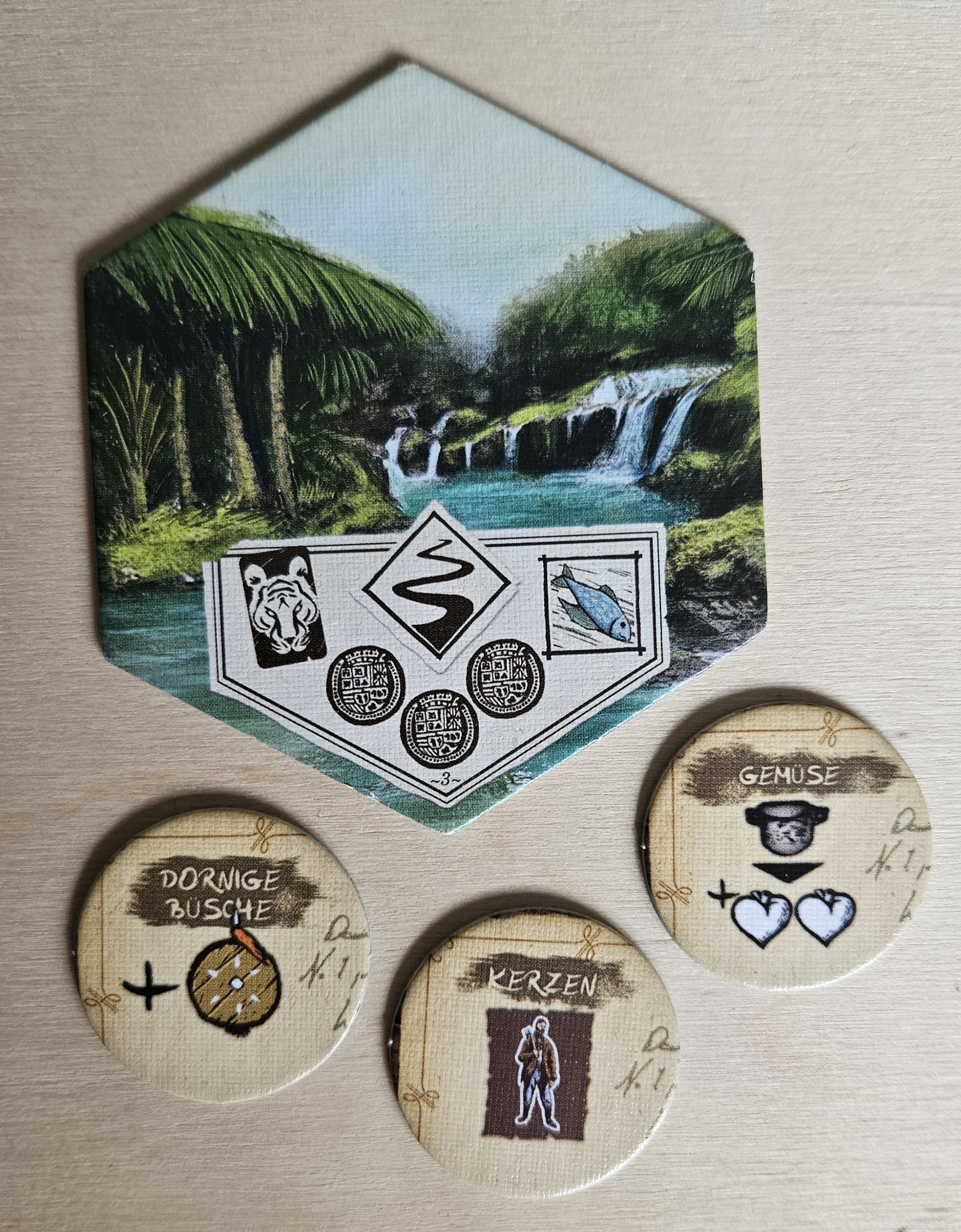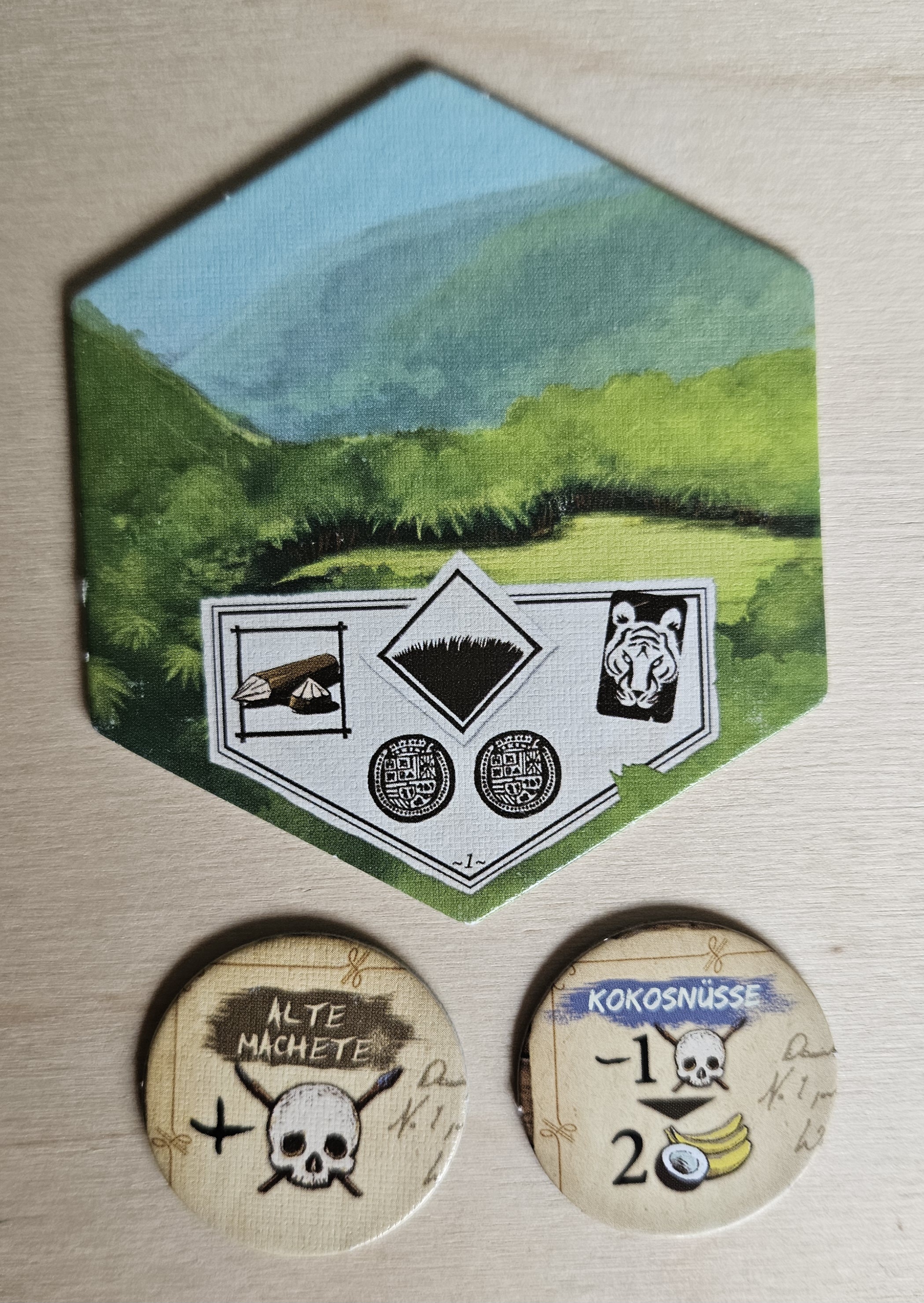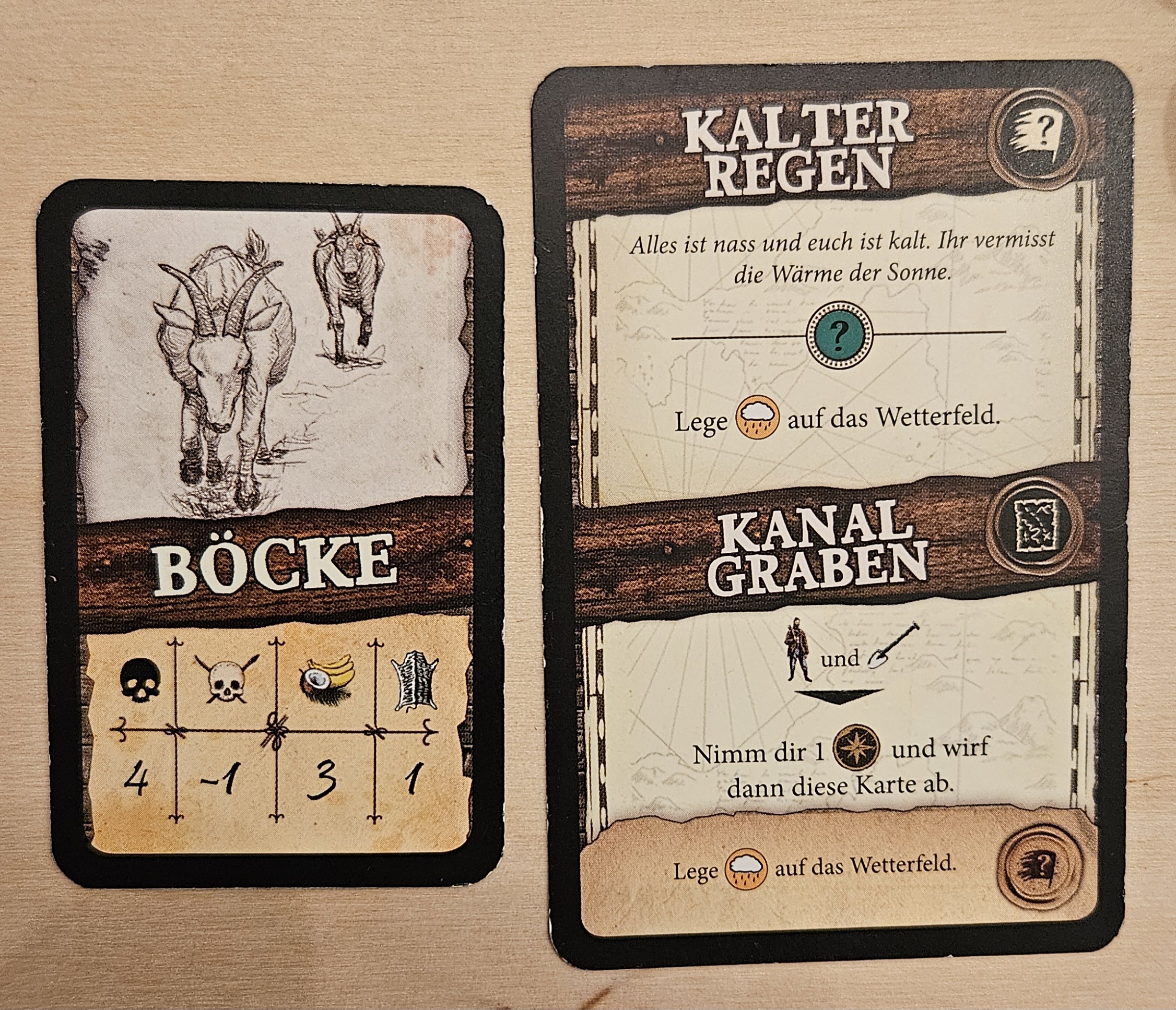 Zur Zeit haben wir 1x Fell und 4x Holz im Vorrat sowie 2x Nahrung plus den Zwieback (also 3 Nahrung). Dazu kommt noch die Machete, mit der wir entweder 2 Holz oder 2 Waffenstärke erhalten können.