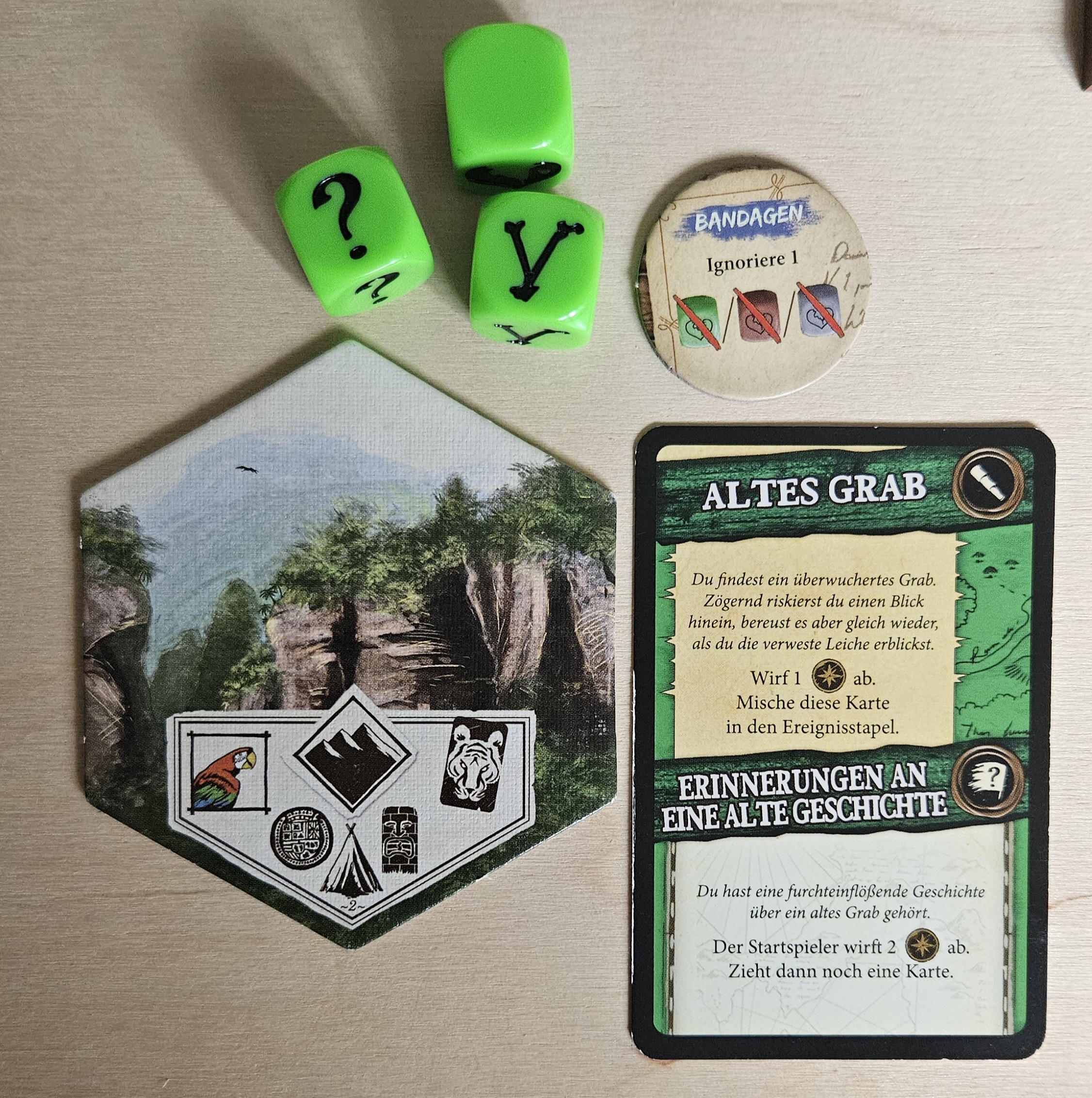 Soldat und Zimmermann setzen je 1 Aktionsstein ein und gehen beim Totem #2 (Verfallenes Dorf) auf Erkundung. Sie würfeln die grünen Abenteuerwürfel: der Soldat erleidet eine Wunde, die Aktion ist erfolgreich und sie ziehen eine Abenteuerkarte.