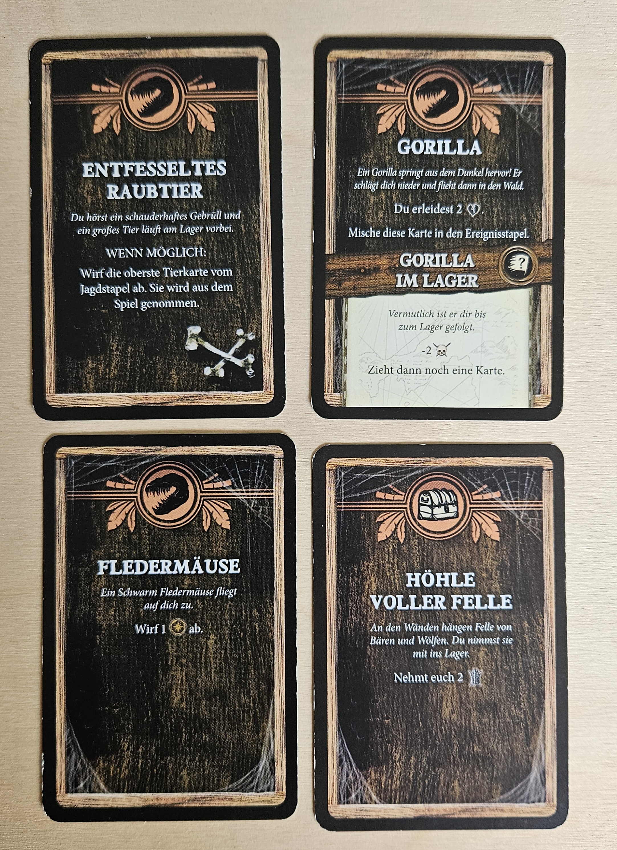 Weitere 4 Geheimniskarten werden gezogen: Die oberste Tierkarte vom Jagdstapel wird abgeworfen, James erleidet 2 Wunden (die Moral sinkt zum Glück noch nicht) und muss anschließend 1 Entschlossenheitsplättchen abwerfen. Anschließend erhalten wir 2 Felle.