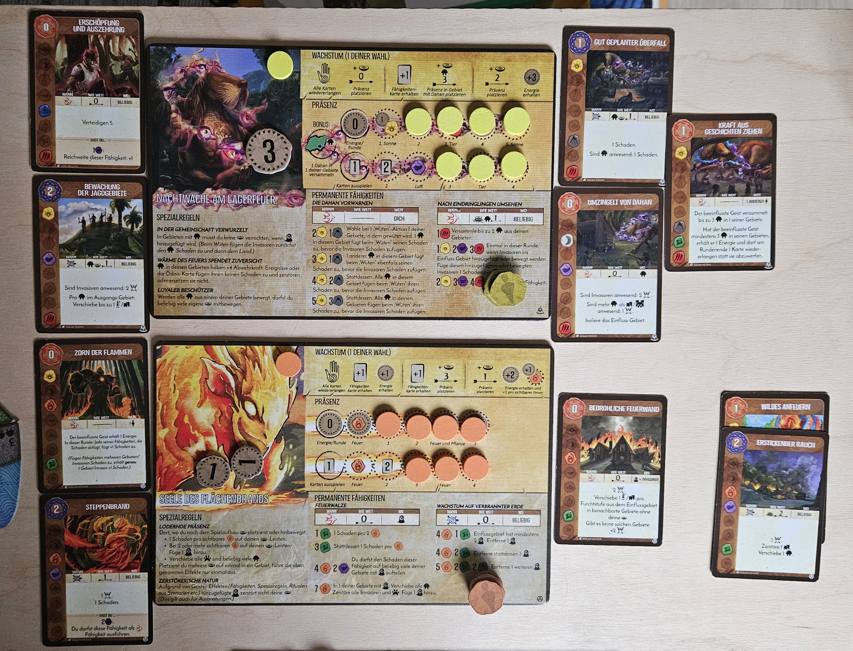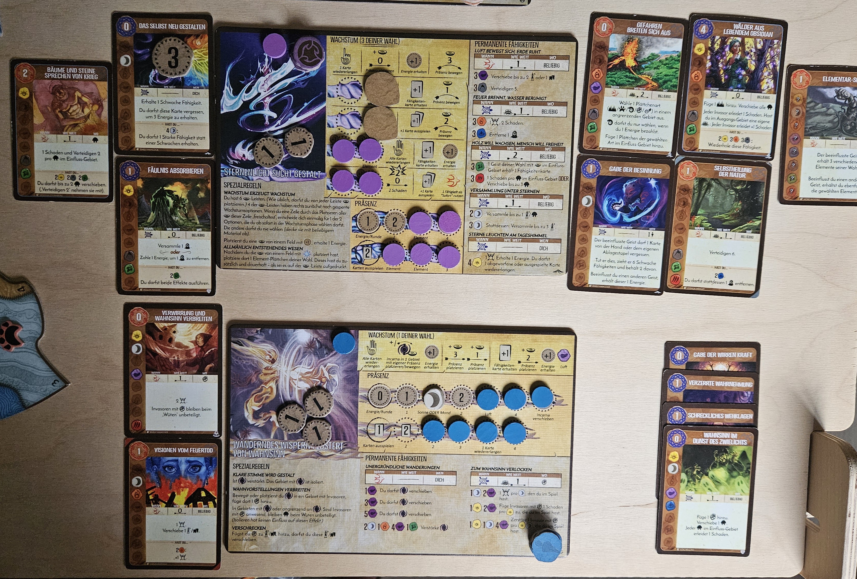 Ich bekomme 2+1 Energie, wähle das Sonnenelement und spiele 2 Karten aus.