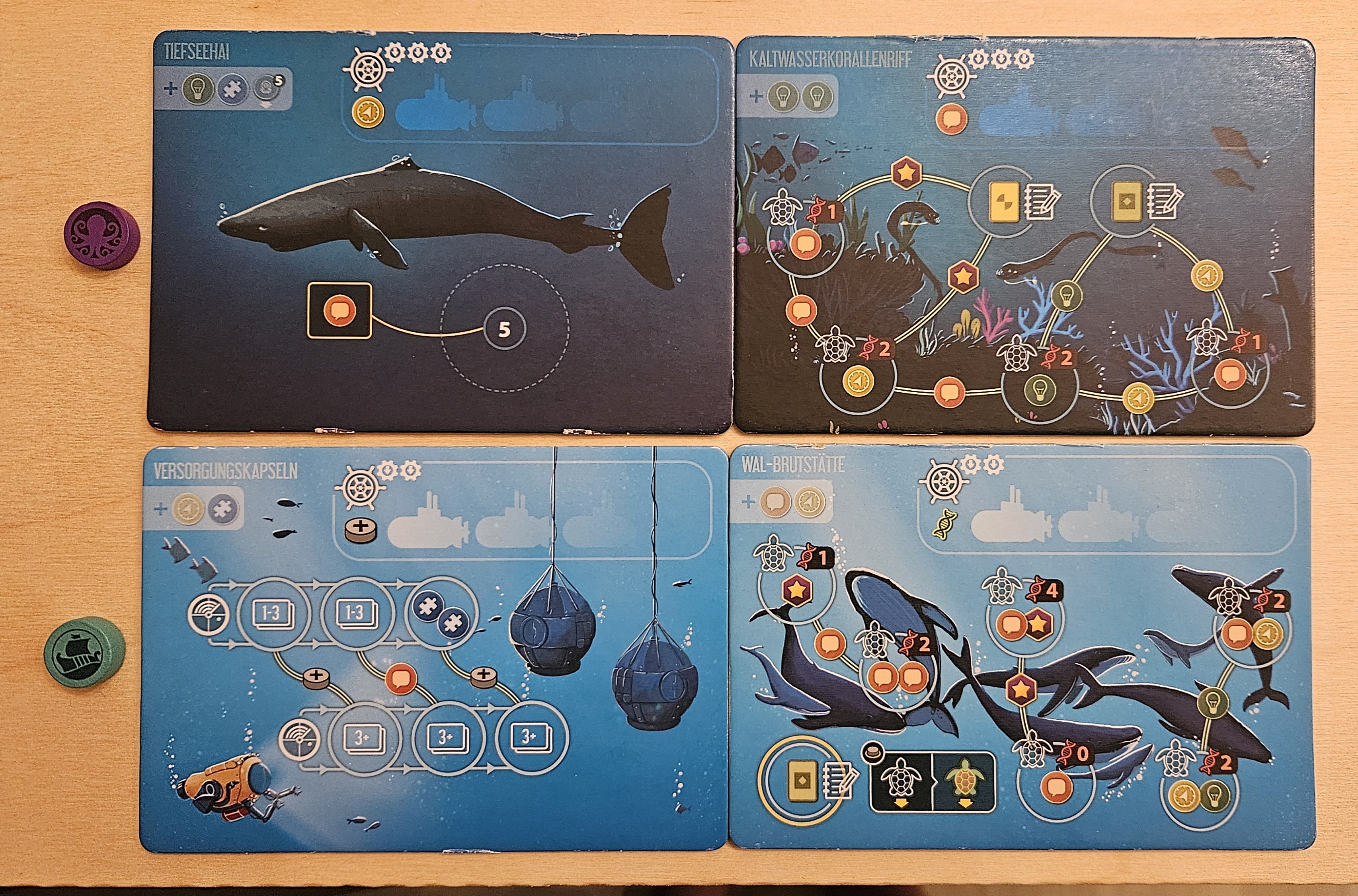 Oktopus AG gibt ihrer Expeditionsleiterin (Sonar-Technikerin mit Bewegungsmarker) den Auftrag, das U-Boot von der Akademie zur Roboter-Station zu bewegen. Dort angekommen wird zunächst der Roboter für Wartungsarbeiten kurz zur Station zurückgeholt und anschließend wieder ins Tal der Gräben geschickt, um ein Sonar auszuführen. 2x Tiefe 3 und +1 Organisation