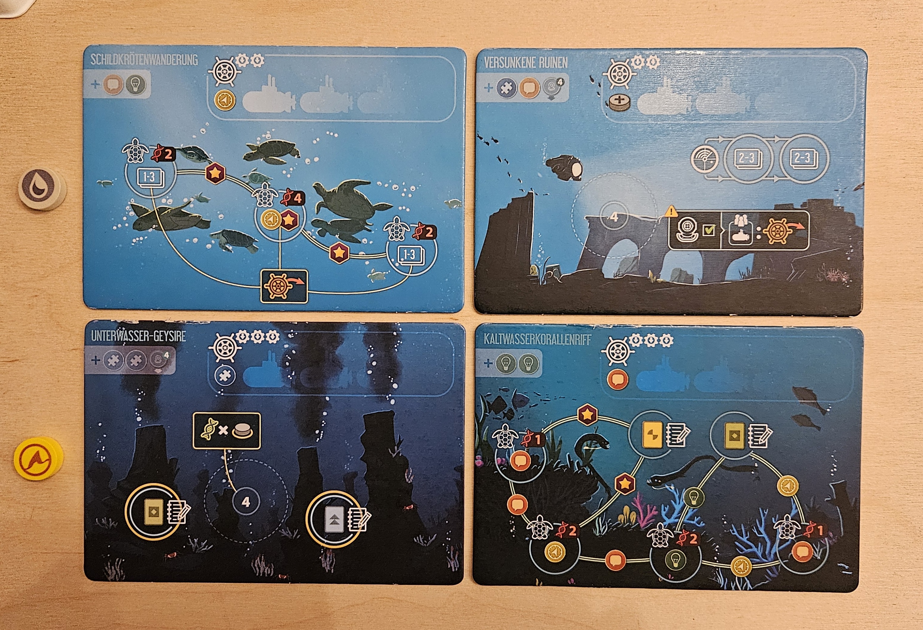 Die Riff-Ranger schicken ein paar Versorgungskapseln in die Tiefe (Spalte D) und erhalten +1 Organisation und +1 Genialität. Dadurch erhalten auch sie ihr zweites U-Boot, welches an der Seestern-Station ankert. +1 Scheibe