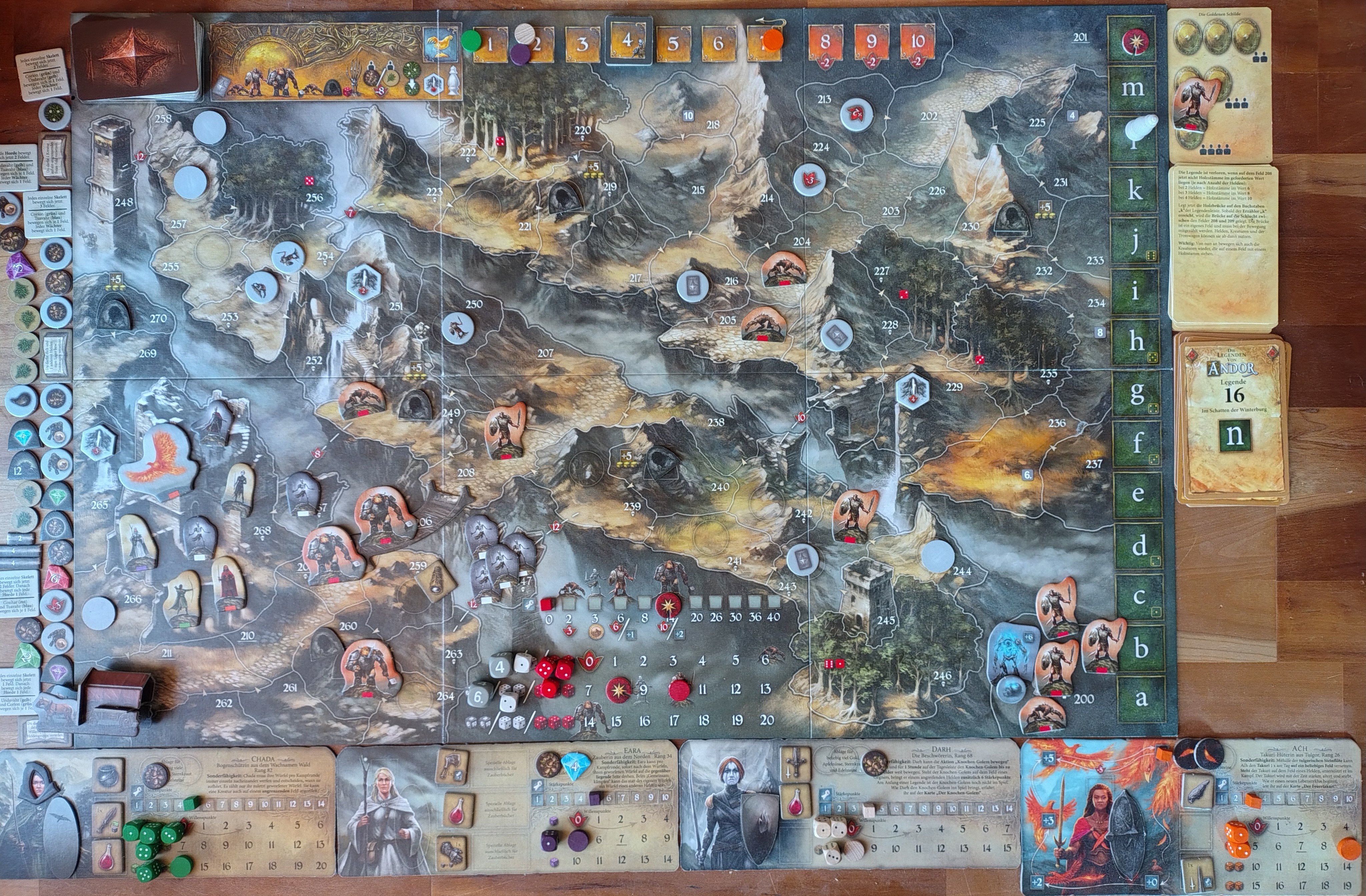 Chada schießt auf den Bergskral, Eara, Darh und Turr unterstützen. Chada lässt Pfeile niederregnen, alle meilenweit daneben. Schließlich hat Eara Mitleid und lenkt einen Pfeil ins Ziel: 4, 1, 2, 1, 1 -> 6. Eara hat ihre magische Energie nun natürlich für Chada aufgebraucht: 1. Auch Darh erbringt keine Bestleistung: 1, 3, 4 -> Kampfwert 29 Aber auch der Bergskral ist nicht in Form: 1, 2, 4 -> Kampfwert 10. Sieg in einer Kampfrunde (2.h + 2.h + 2.h)