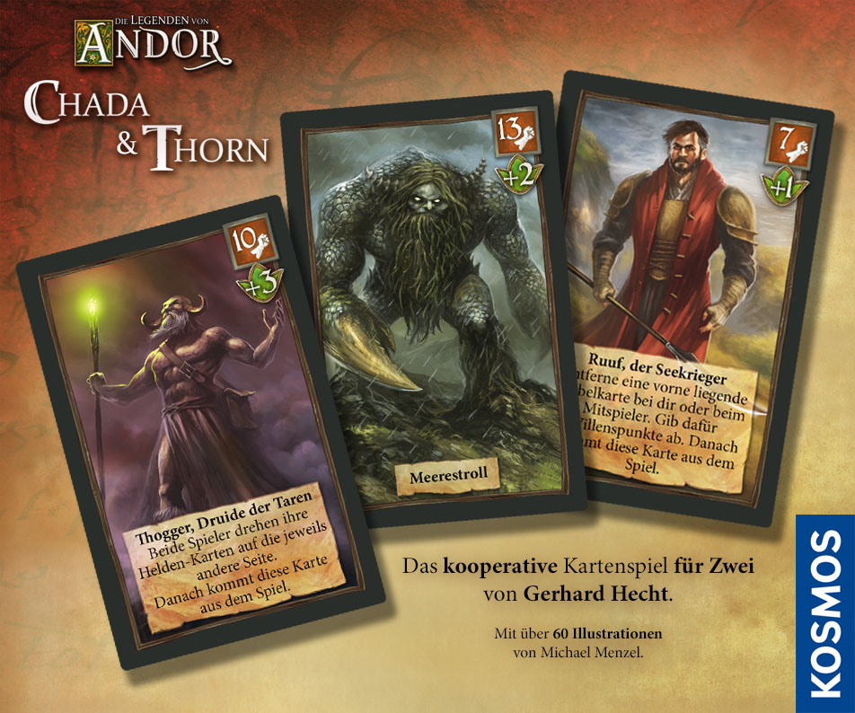 Seit einiger Zeit bin ich mit der Illustration des 2-Personen-Kartenspiels „Die Legenden von Andor – Chada & Thorn“ von Gerhard Hecht beschäftigt.