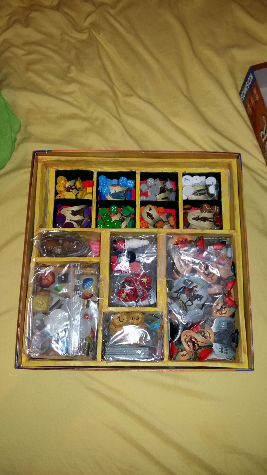 Habe die Sortierung für den Grundspielkarton nach deiner Anleitung gebaut. Das Prinzip der oberen Reihe, wo die Heldentafeln drauf liegen, habe ich abgewandelt auch für die Box rechts unten angewendet. So passt meines Erachtens alles auch schön sortiert rein: